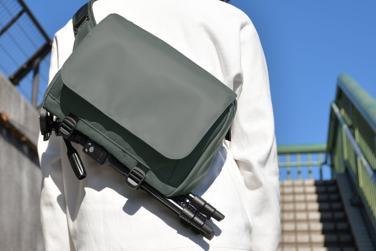 拡張用の底マチのベルト部分には、三脚や折り畳み傘を固定することができます。