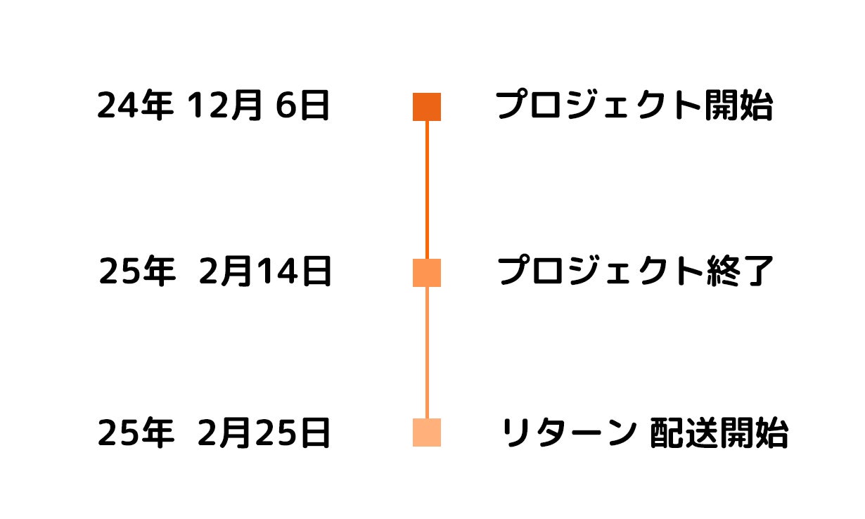 ●引渡し時期: 各リターン詳細に記載の発送予定月を引き渡し時期とします。但し、開発・生産状況によって遅れが生じる場合がありますのでその際は当プロジェクトページ内の「活動報告」または購入者へのメール等で連絡します。