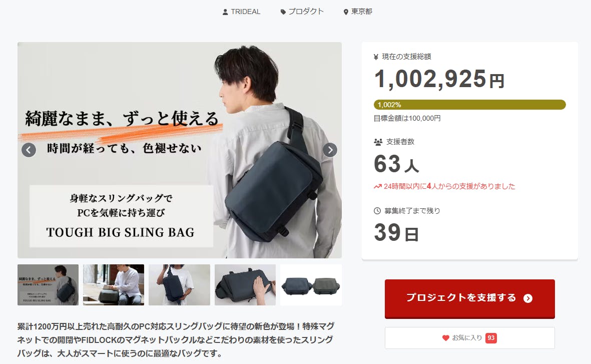 現在プロジェクトを実施している、TOUGH BIG SLING BAGですが、昨日も沢山の方からご支援を頂き、昨夜100万円を突破しました!