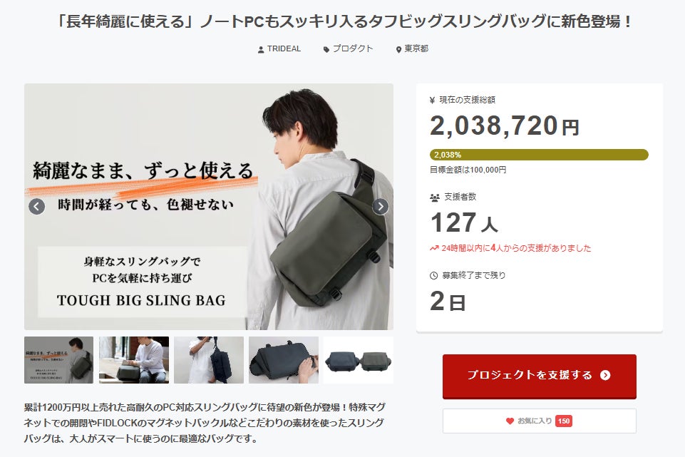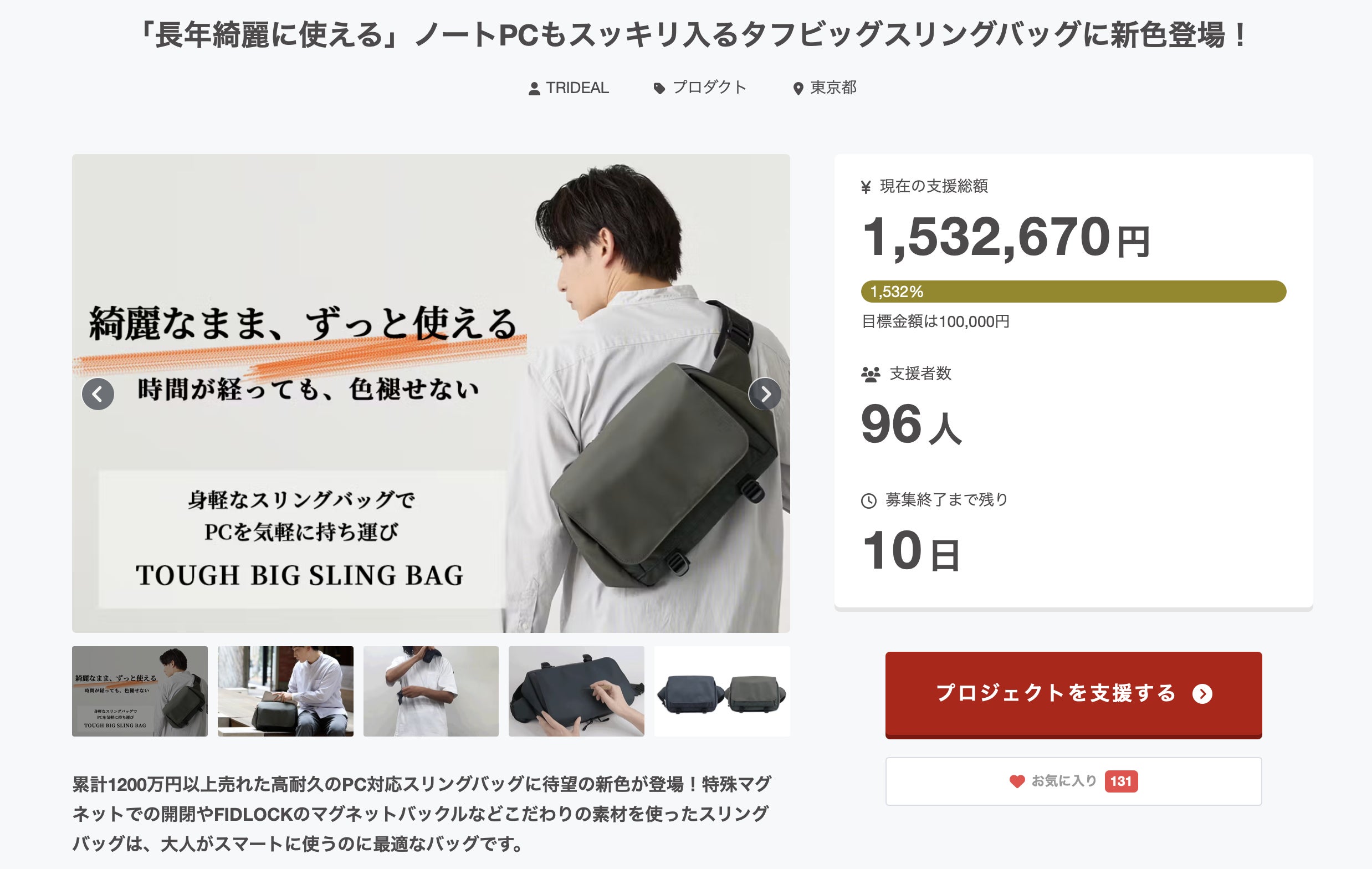 皆さま、こんばんは!TRIDEAL運営チームです。12月6日から始まったタフビッグスリングバッグのプロジェクトもとうとうラスト10日になりました!支援額も昨日150万円を突破いたしました。本当に沢山のご支援ありがとうございます!支援者いただいた方からは、電車通勤で邪魔にならないバッグを探していたという声も頂きました。プロジェクトページに記載にも記載している通り、電車で邪魔にならないことや、リュックと比べて身軽にPCを持ち運ぶことを意識して企画しているので、その部分で共感いただいたこととても嬉しく思います!ぜひラスト10日間になりましたが、一緒にプロジェクトのラストスパートを盛り上げていただけると嬉しいです。それでは最後までチーム一同プロジェクトをしっかり遂行いたしますので、引き続き応援とご支援宜しくお願い致します。TRIDEAL運営千坂