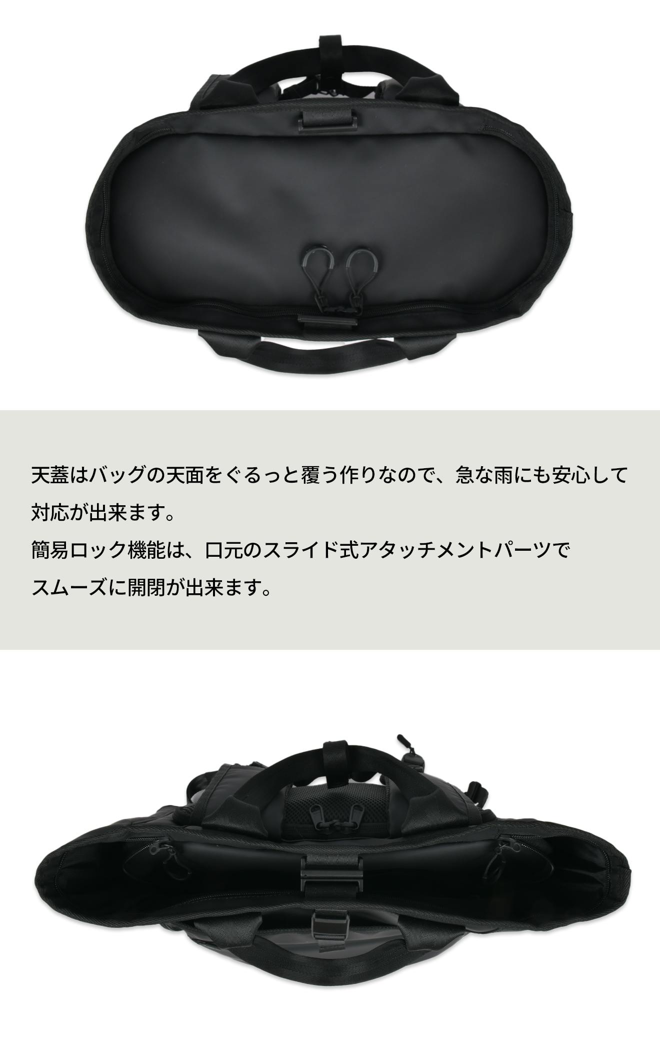 天蓋にも本体と同じ耐水性が高い素材を使い、YKKの撥水ファスナーを使用しているので、雨の日でもバッグ内の荷物をしっかり守ってくれます。