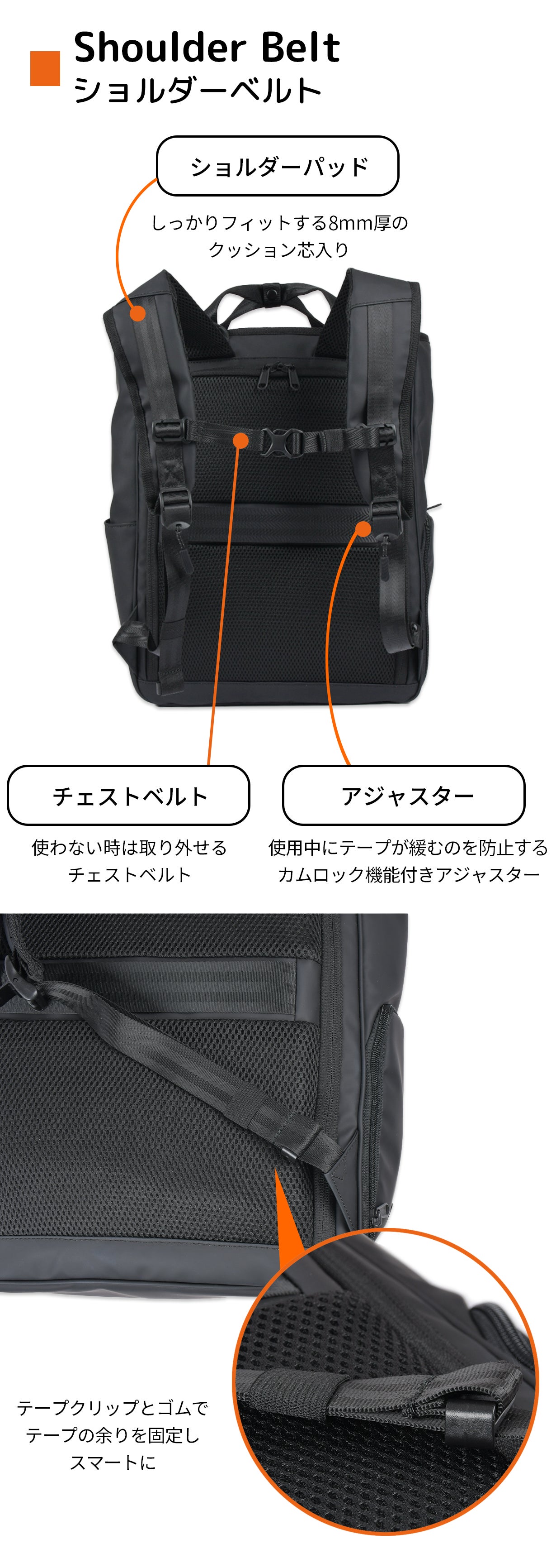 TOUGH GYM BACKPACKには、テープが伸びないようにロックするアジャスターを採用。