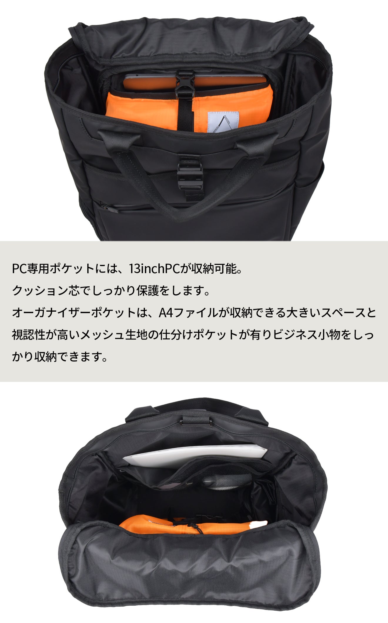 PC用の収納スペースや、小物を仕分けするオーガナイザーポケット、A4ファイル収納スペースなど、毎日のビジネスで欠かせない物もそれぞれに専用スペースを設け、整理整頓しながら収納が可能です。