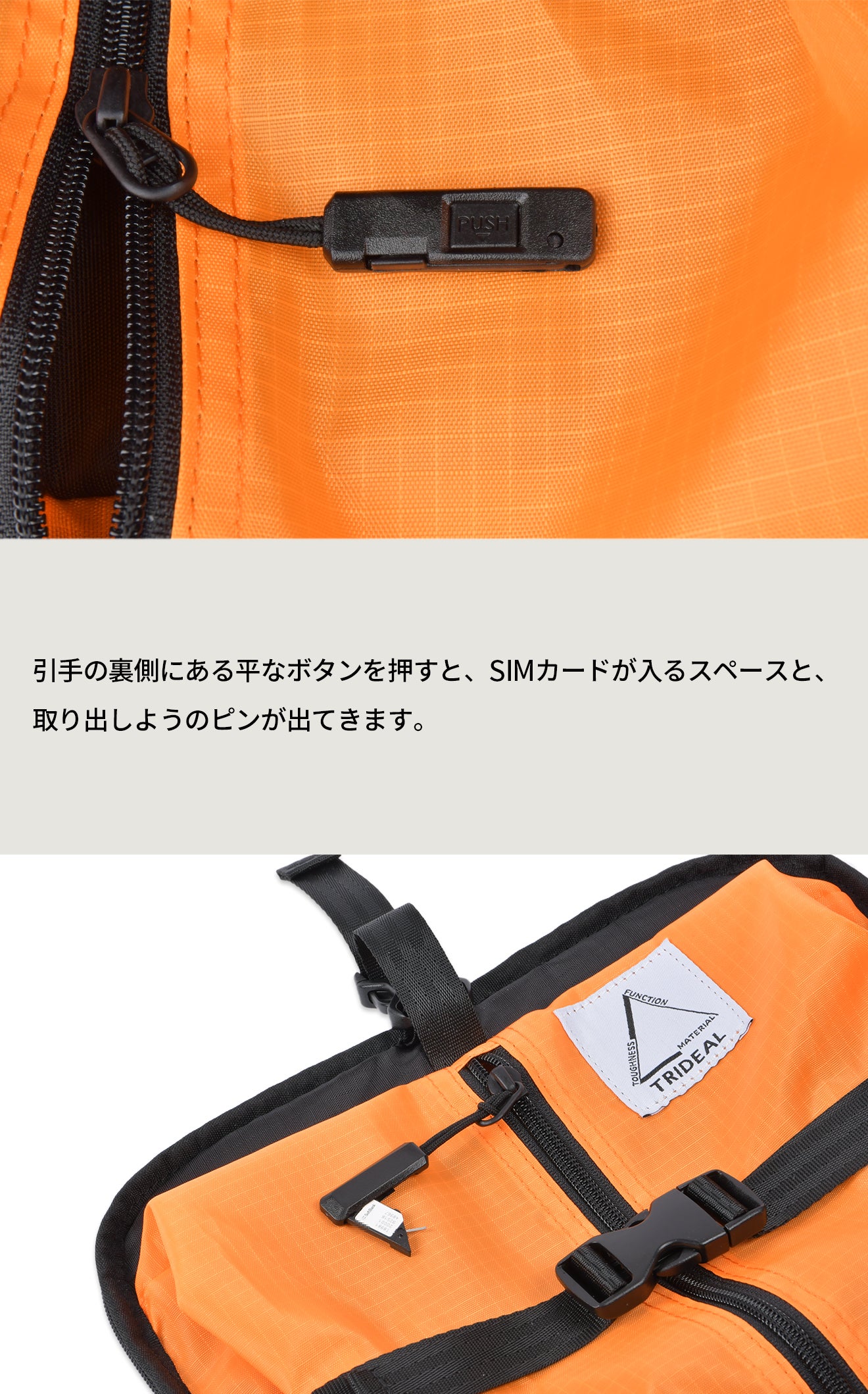 衣類収納のオレンジのポケットには、SIMカードを収納できる引手が付いています。