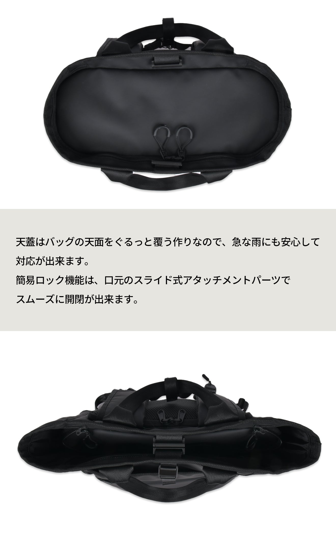 本体の開閉はファスナーで開閉する天蓋と、アタッチメントパーツを使った簡易ロック機能を使い分けることが出来ます。