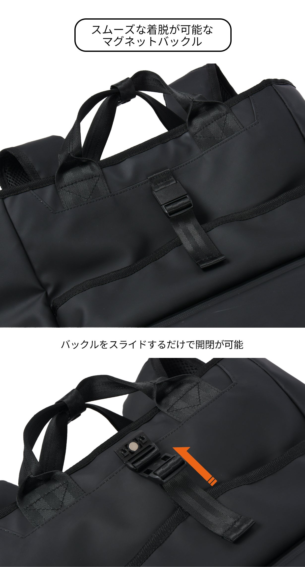 本体の開閉はファスナーで開閉する天蓋と、アタッチメントパーツを使った簡易ロック機能を使い分けることが出来ます。