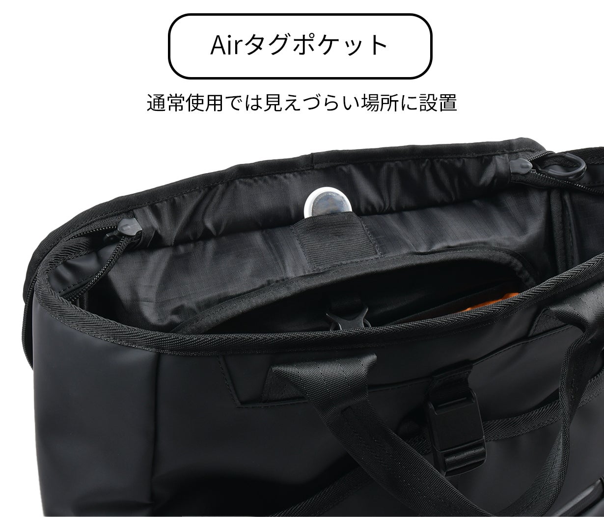 天蓋にも本体と同じ耐水性が高い素材を使い、YKKの撥水ファスナーを使用しているので、雨の日でもバッグ内の荷物をしっかり守ってくれます。