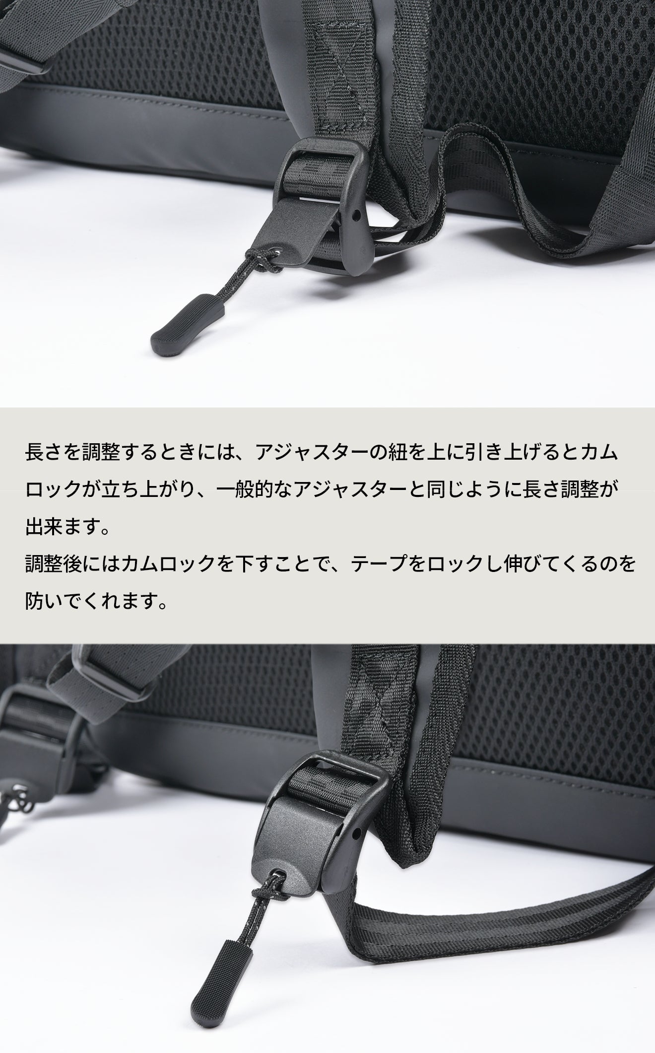 TOUGH GYM BACKPACKには、テープが伸びないようにロックするアジャスターを採用。