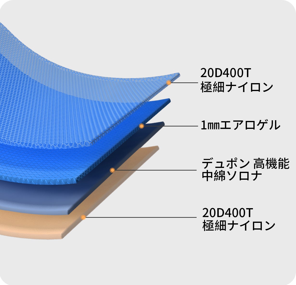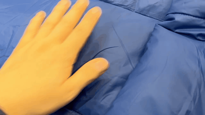 この特性を寝袋にも活用し、表面・裏面生地にエアロゲルを配合した生地を使います。なるべく荷物のかさばりを防ぎたいキャンプや登山など、アウトドアで便利に持ち運びいただけるよう、さらに薄さを追求し、1mmエアロゲル生地で軽量かつコンパクトに設計しました。