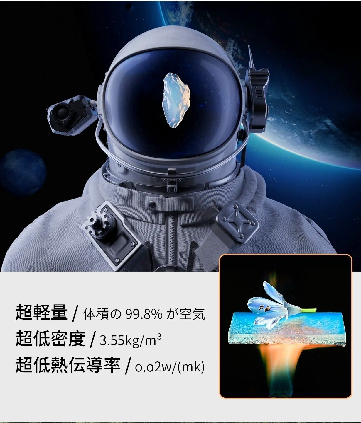 非常に軽く断熱性の高い性質を持つ「エアロゲル」は、その断熱性の高さから過酷な環境で着用する”宇宙服”にも使われており、素材の厚さわずか2mmという薄さで-196℃をも断熱する機能があります。