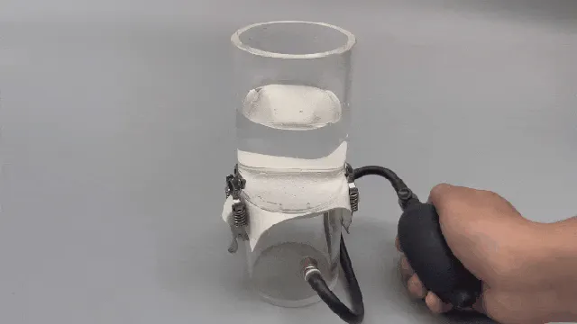 エアロゲル素材は、断熱性と通気性を兼ね備えた画期的な素材です。下記の実験では、下の容器から挿入した空気が、エアロゲル素材を介してしっかり外へ通っていることから通気性の高さがわかります。