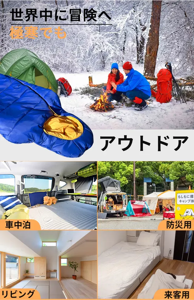 「エアロゲル」を使用した高機能シュラフは、薄手で保温性が高いため、アウトドア愛好者だけでなく、車中泊、防災用品や急な来客に備える方が便利にご利用いただけると思い、企画いたしました。