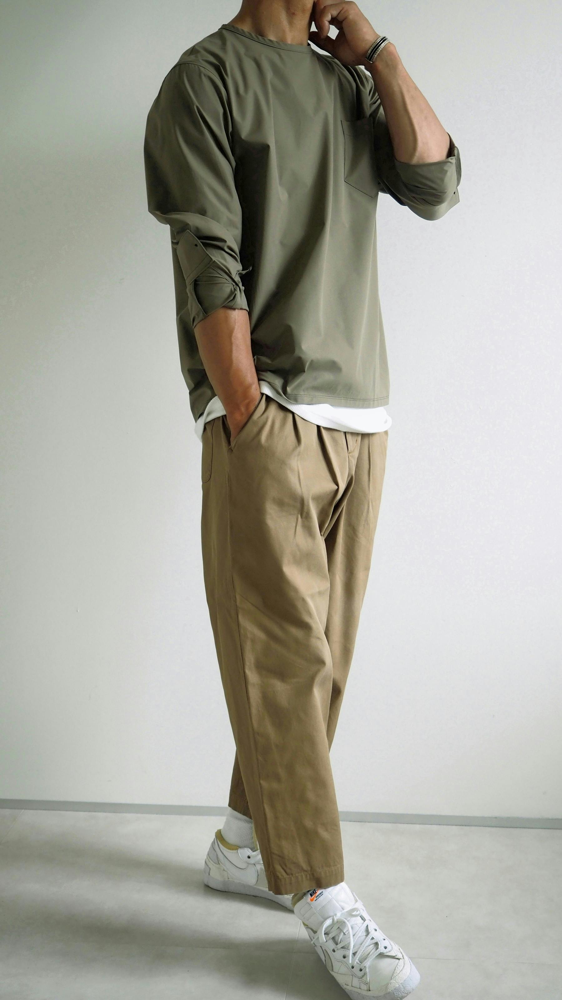 ★カジュアル目なパンツと最も相性が良いのが、このミリタリー調のカーキ。黒パンツなどの濃色から、グレーや白といった淡色のパンツとも相性が良く、肩の力が抜けた大人のラフさを演出します。仕事着はもちろん休日やレジャーの装いにも、もってこいです。