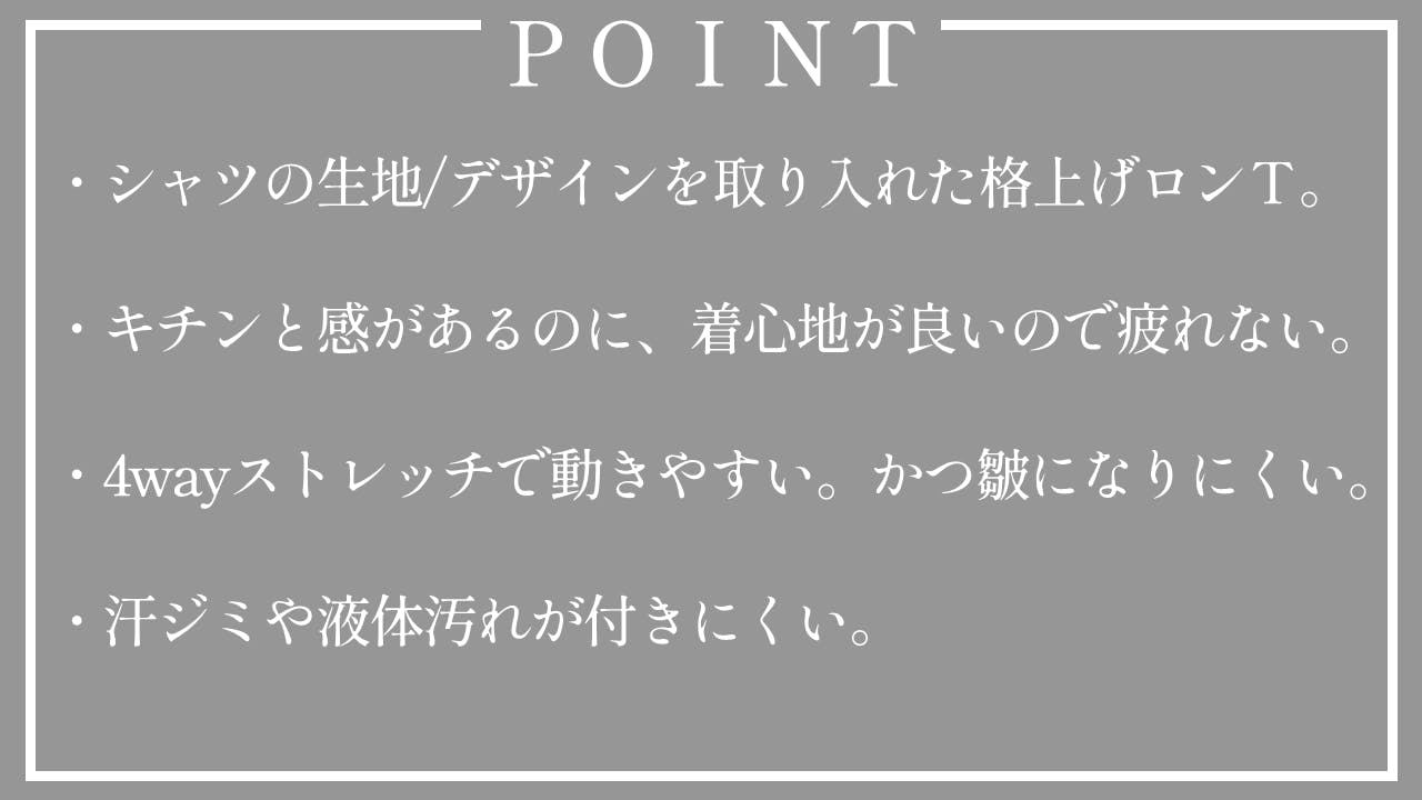 そう、胸や袖などにプリントの入ったロンTだと子供っぽく見え、かといって綿無地のロンTだと何だか肌着っぽく見えて野暮ったい、、、。普段着としてもそうですが、仕事着として使う場合は尚更です。特にキレイ目なパンツ(スラックスなど)との相性が悪い、、、。