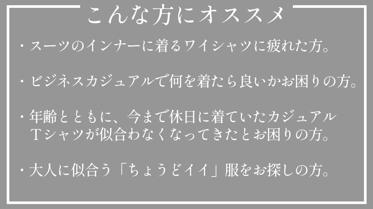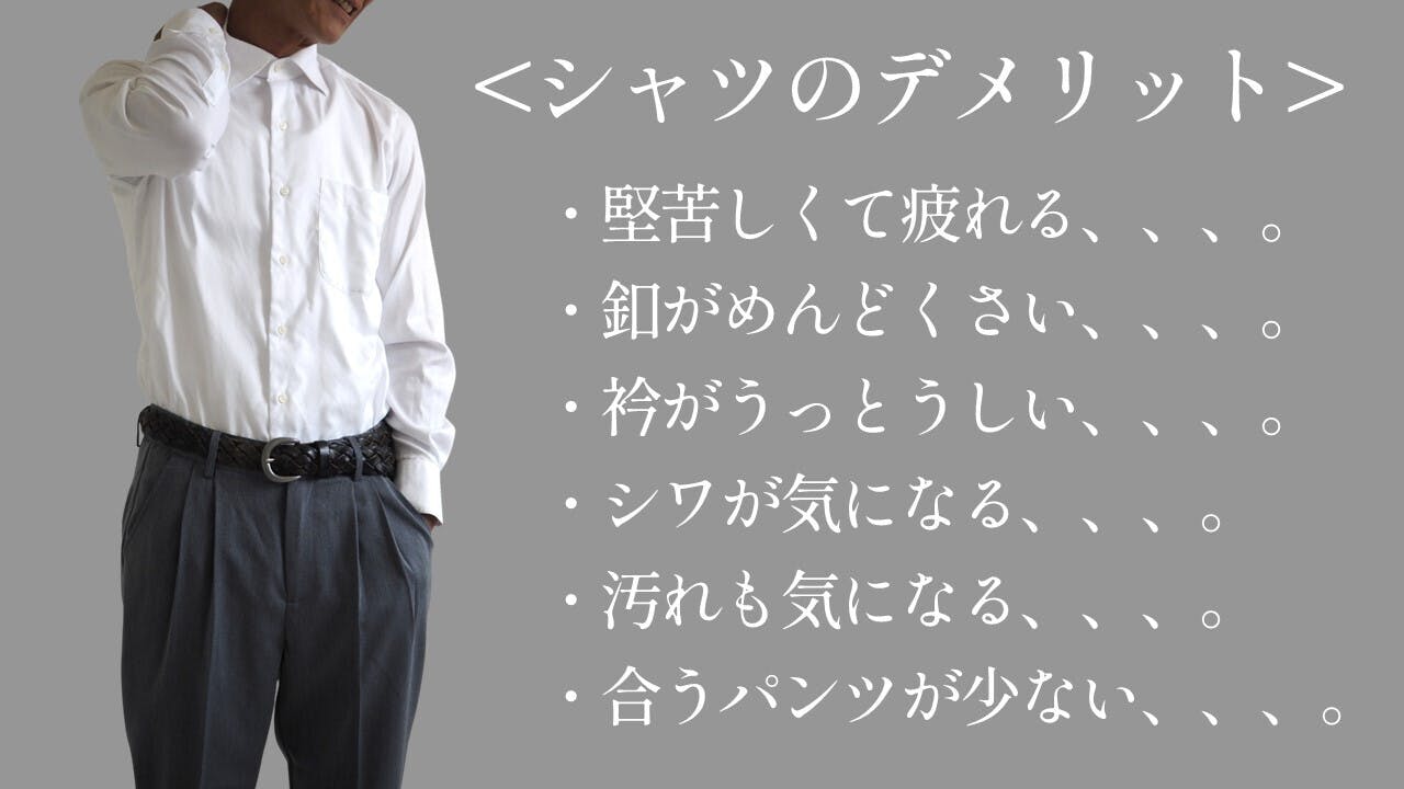 気が付けば「オジサン」と言われる年齢に差し掛かり、本当はパリッとしたシャツを小粋に着こなせるようなイケオジにも憧れますが、シャツは堅苦しくて疲れるし、釦の開け閉めもめんどくさい、首回りの衿が鬱陶しい。普段着として着る場合、カジュアルパンツとはコーディネートしにくい、、、。
