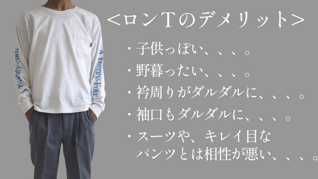 ここで言うロンTとはいわゆる長袖のTシャツの事で、「真夏以外に着るTシャツ」としてその気軽さから私もよく着ているアイテムです。ただ、年齢を重ねるにつれて気付いた事が、、、。