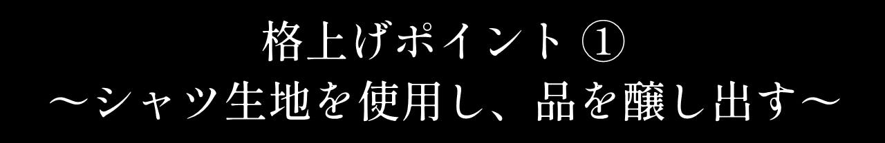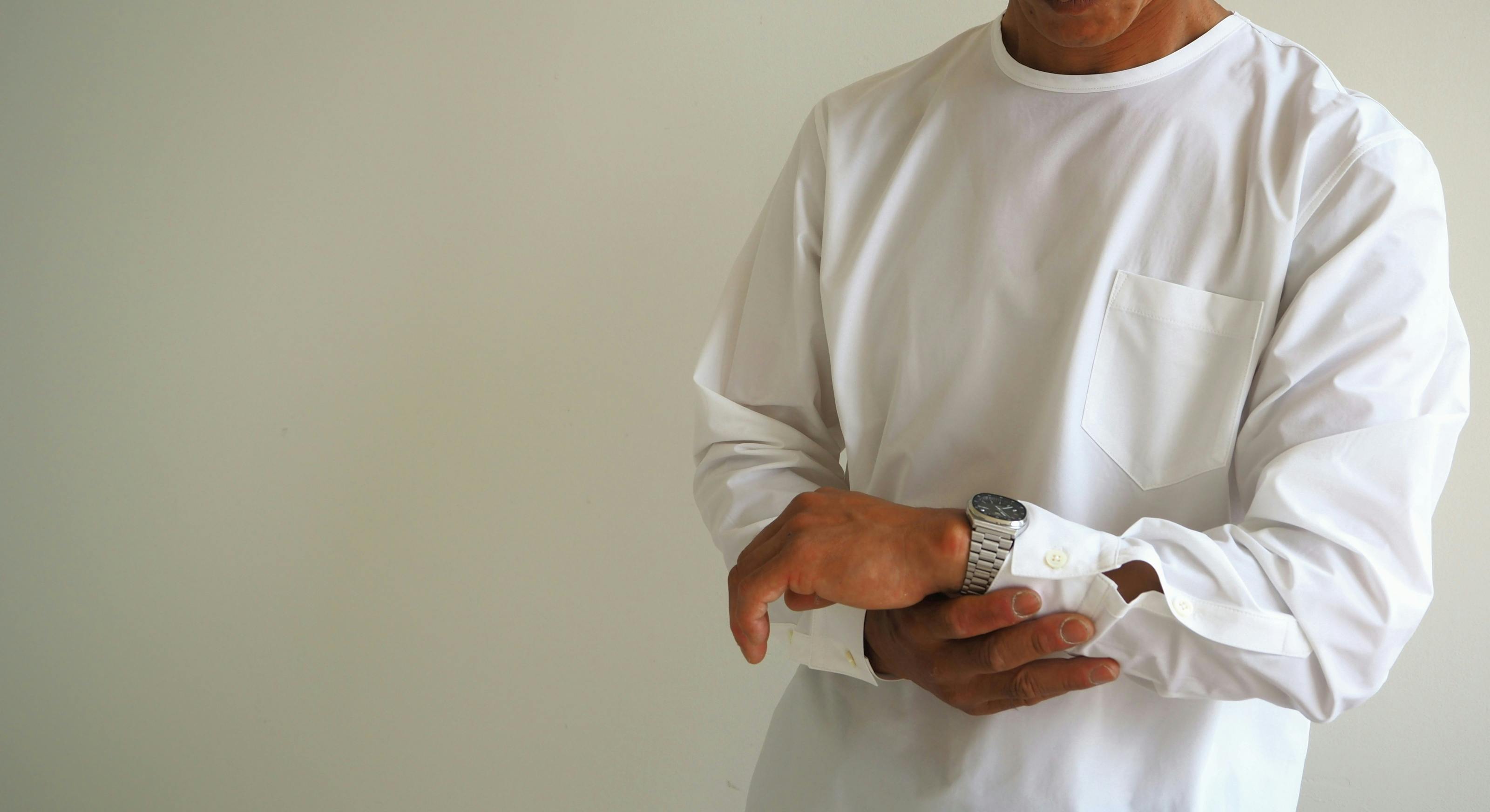 カットソー(編み生地)ではなく布帛生地(織り生地)を使用する事により、普通のカットソーのロンTには無い清潔感や、落ち着いた上品さが生まれ、凛とした大人の色気を醸し出します
