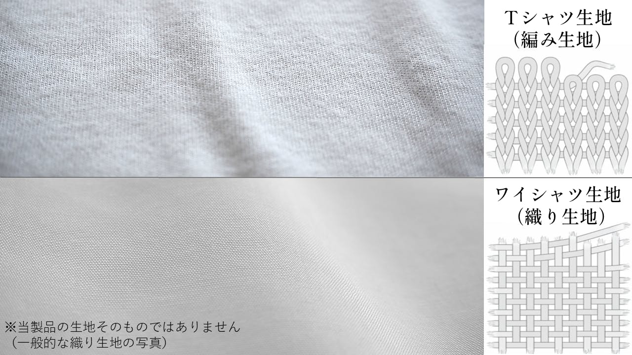 通常、Tシャツに使われる生地はカットソーと呼ばれる「編み生地」なのですが、この【大人ロンT】はワイシャツやブラウスに使われるような布帛生地、つまりは「織り生地」を使用しています。