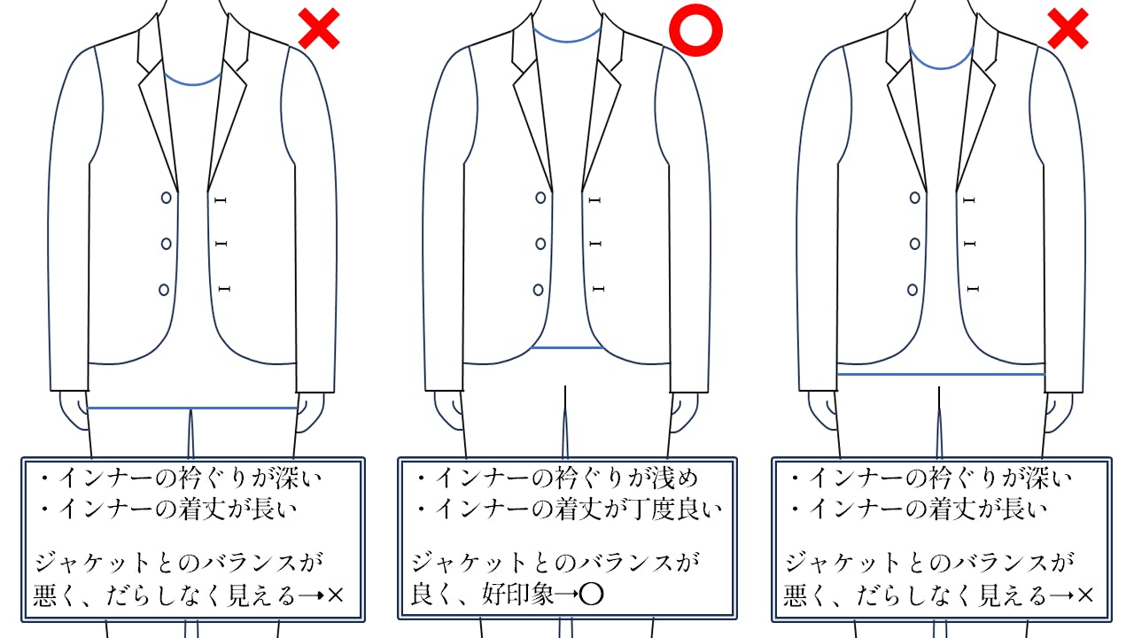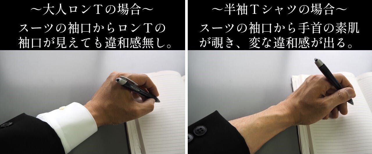 ・半袖Tの場合、スーツのジャケット袖口から素肌が覗き、変な違和感が出る。