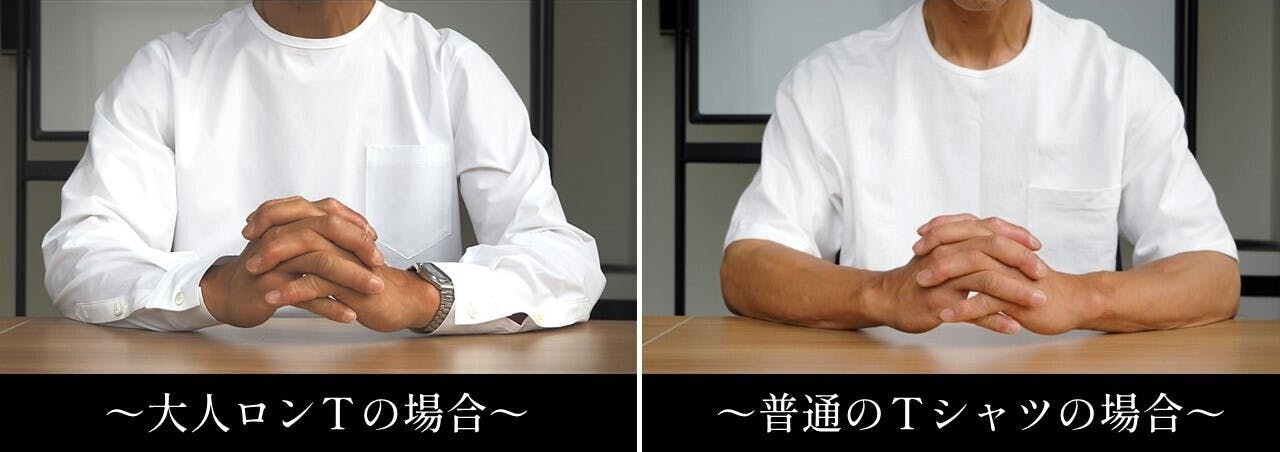 しかし想像してみて下さい。そのジャケットを脱いだ途端、上半身だけを見るとそれまでの「出来るビジネスマン」がただの「Tシャツおじさん」になってしまいます、、、。ビジネスの場において商談や会議/打合せなど、他者と接する際は座っている状況が多く、つまりはその人の上半身しか見えていない事になり、必然的に「Tシャツおじさん」の出現率は高くなります。でも、【大人ロンT】であればその出現率は抑えられます。