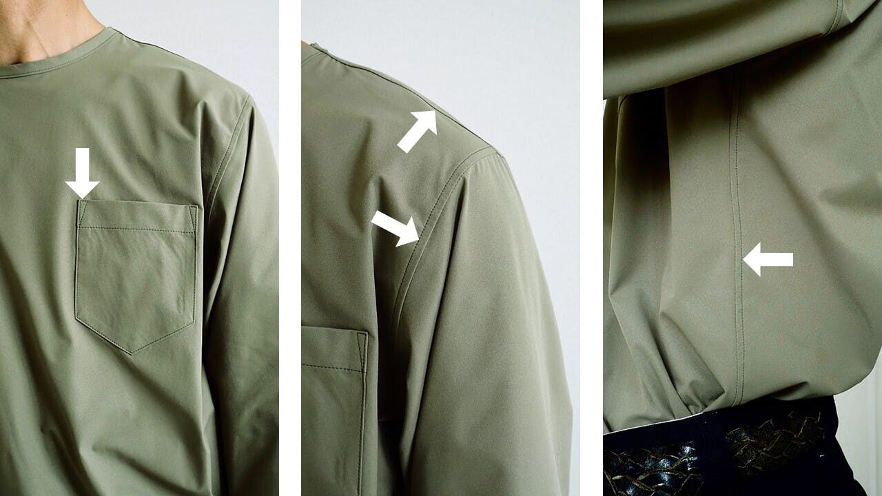 なお、着丈の設定は上に着るジャケットとのバランスを考えて、長すぎない丈にしてあります。丈が長いと、裾を出して着た時にインナー丈がジャケット丈と同寸、またはジャケット丈より長くなりカッコ悪いからです。パンツポケットに手を入れた際に、インナー裾にシワが寄り過ぎないくらいの丈感がポイントです。