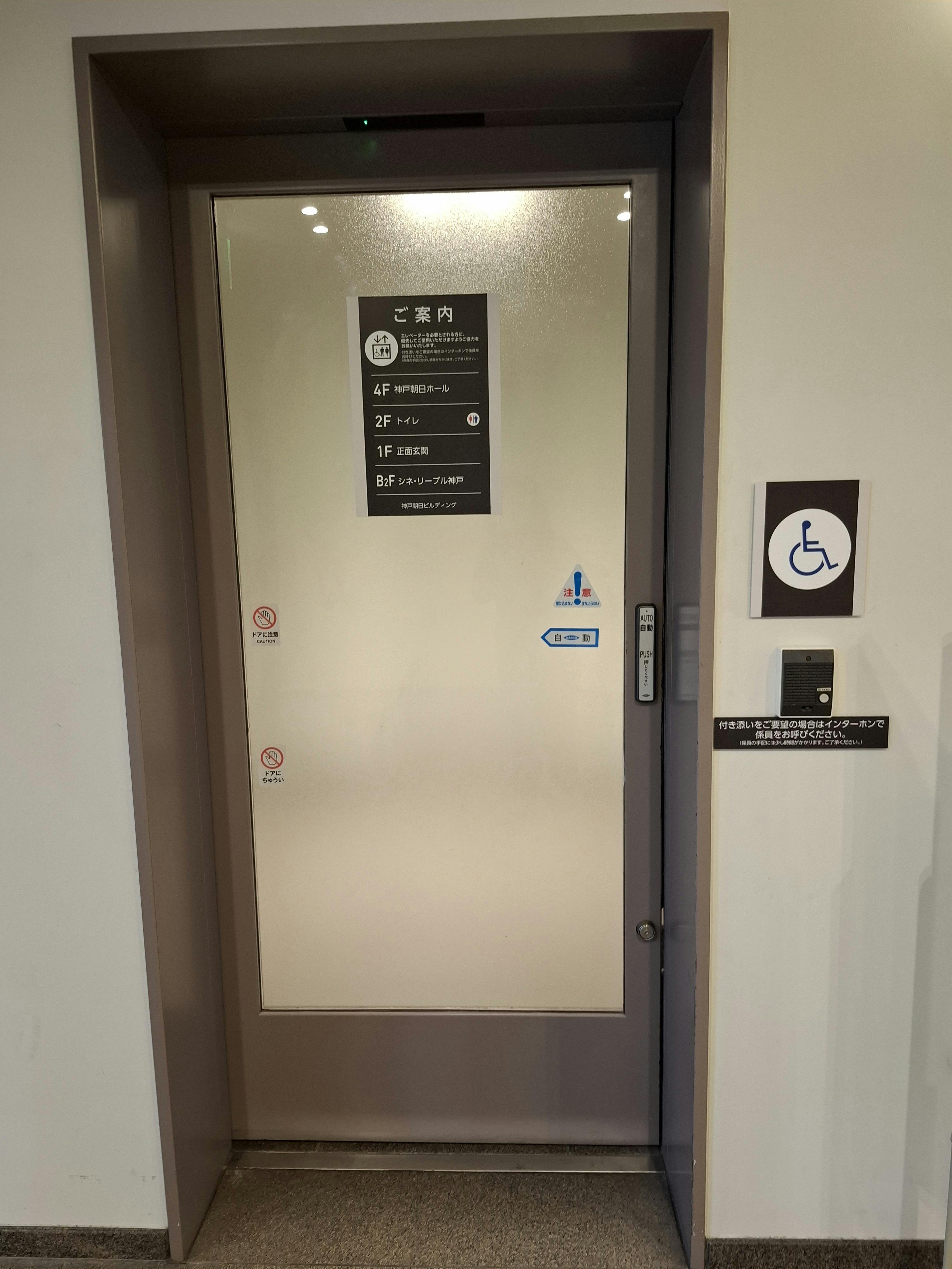 付き添いを要する方は、「KOBE ASAHI HALL」と書いた入り口から入り、インターホンを押して係員を呼んでください。