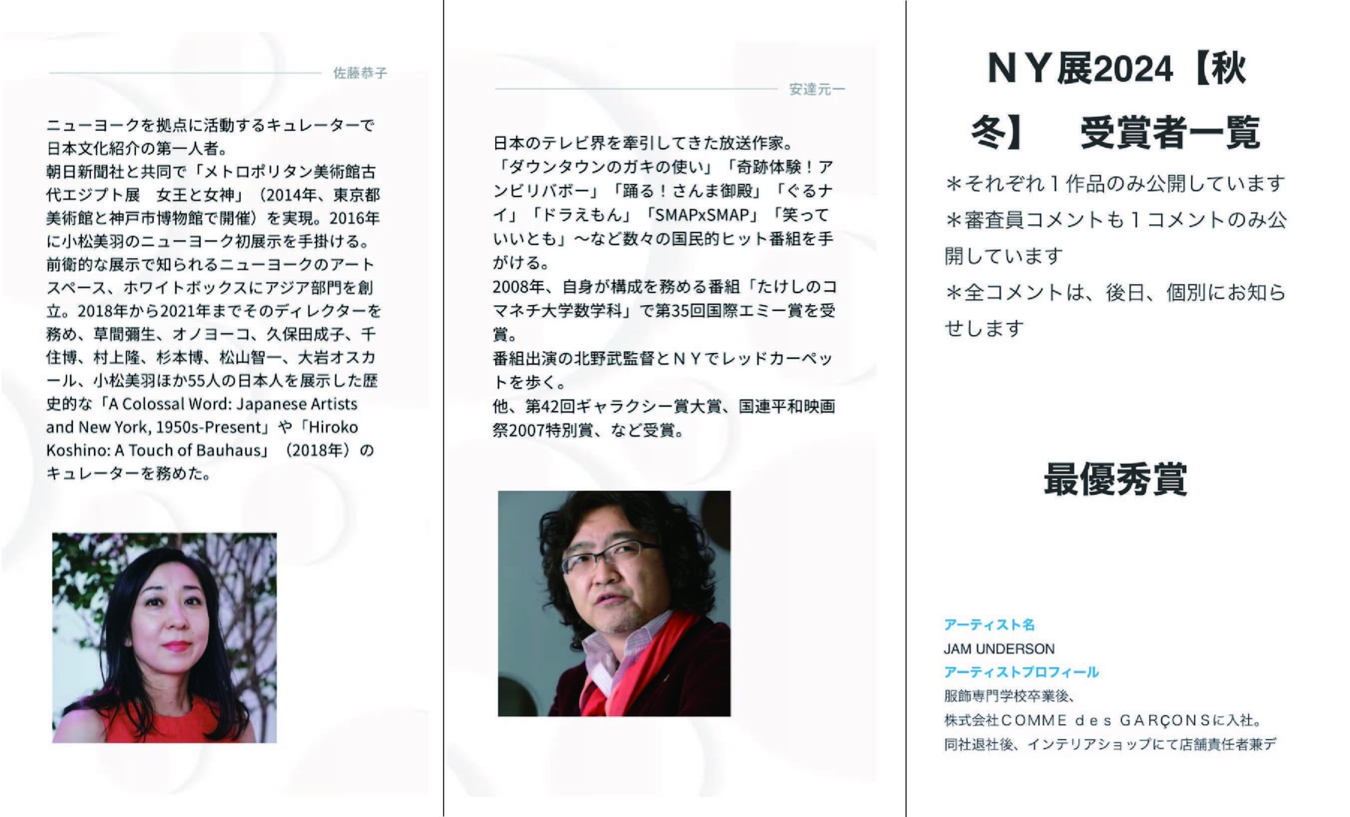 今回私がグランプリを受賞した審査をして下さった審査員の方々が凄い方々で、ニューヨークのアート界で長年キュレーション活動をするキュレーター佐藤恭子さんと、国際エミー賞受賞放送作家の安達元一さんを中心に、銀座にあるギャラリーのオーナーさん、世界的名門大学の教授さん等多数の方々でした!