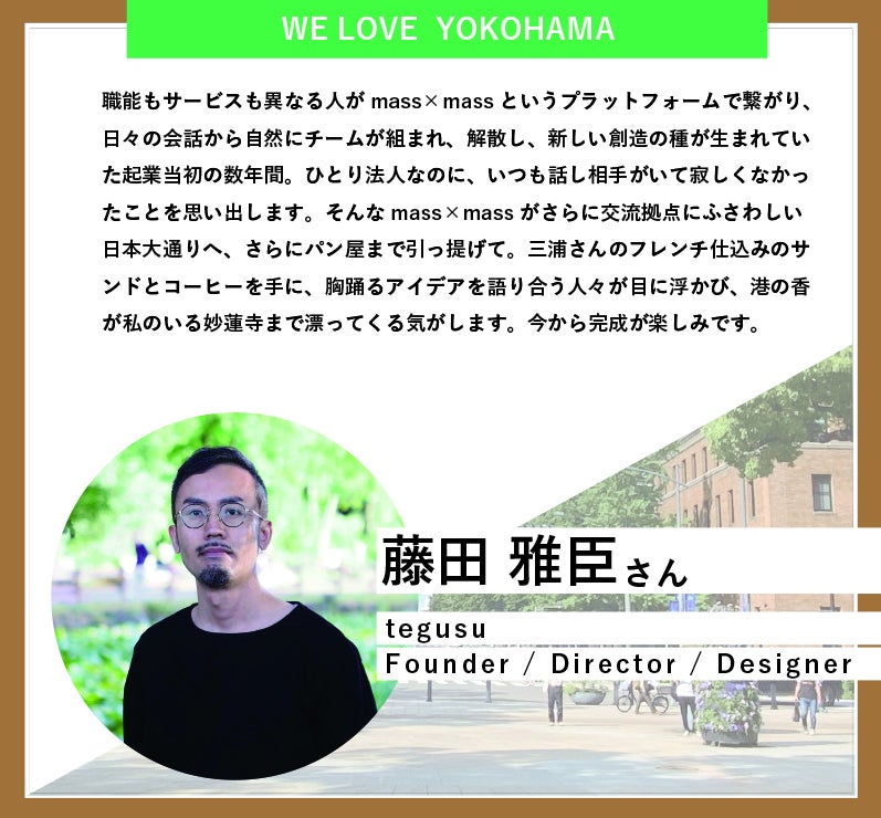 シェフ三浦の友人でもあり、横浜・mass×massコミュニティ繋がりで、いつも応援してくださる藤田さんから応援メッセージが届きました!藤田さん、応援コメントありがとうございます!残り22日!!引き続き皆さんのご支援お待ちしております!----------Founder / Director / Designer藤田 雅臣 | Masaomi Fujita静岡県生まれ。静岡文化芸術大学卒。都内で企画・編集・ディレクション・デザインなどの業務を経験した後、2012年デザインスタジオ「tegusu」を創業。2016年に「tegusu Inc.」を設立し横浜市中区に移転。企業や店舗、商品・サービスのCI・VI計画を中心に、ロゴ、サイン、パッケージ、装丁、広報物、プロジェクトの企画サポートまで、幅広い領域で活動。情報編集、コンセプト設計、ビジュアルライズまで、一貫して行うデザインワークを大切にしている。社会課題のグラフをアートで発信する「一般社団法人チャートプロジェクト」理事。