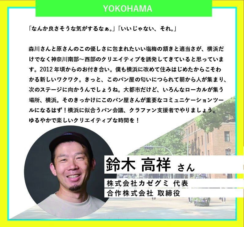 横浜で一緒に活動していた株式会社カゼグミの鈴木さんから応援メッセージを頂戴しました!https://kazegumix.co.jp/いつも応援ありがとうございます!カゼグミの横浜拠点、是非マスマスへパンも家族で食べにきてください!========「なんか良さそうな気がするなぁ。」「いいじゃない、それ。」森川さんと原さんのこの優しさに包まれたいい塩梅の頷きと適当さが、横浜だけでなく神奈川南部~西部のクリエイティブを誘発してきていると思っています。2012年頃からのお付き合い。僕も横浜に改めて住みはじめたからこそわかる新しいワクワク。きっと、このパン屋の匂いにつられて朝から人が集まり、次のステージに向かうんでしょうね。大都市だけど、いろんなローカルが集う場所、横浜。そのきっかけにこのパン屋さんが重要なコミュニケーションツールになるはず!横浜に似合うパン会議、クラファン支援者でやりましょう。ゆるやかで楽しいクリエイティブな時間を!