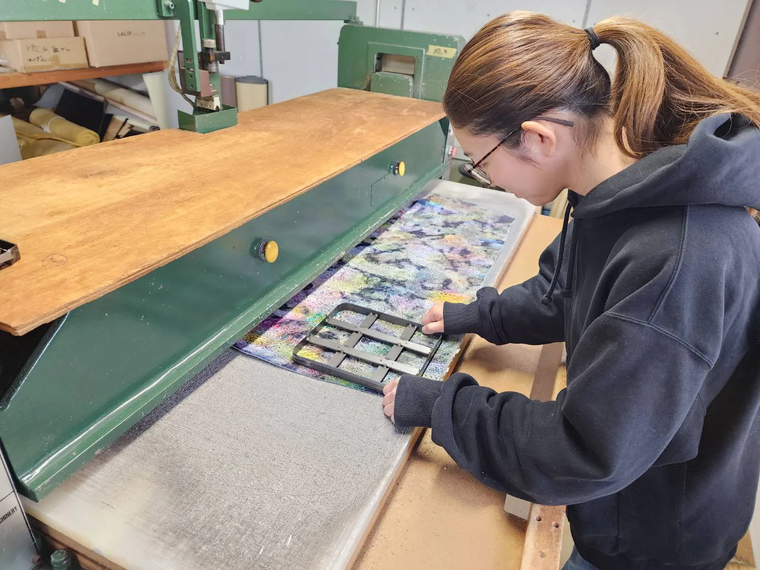 イメージがつけば、大きな裁断機でパーツを裁断していきます。