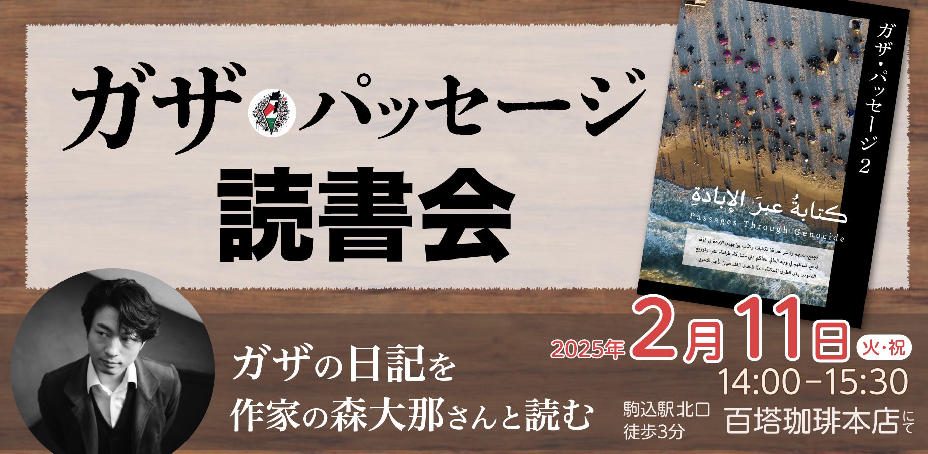 CAMPFIREにご支援くださった皆さまへこんばんは。皆さま、いかがお過ごしでしょうか。この度、2回目の読書会の詳細が決定いたしましたので、お知らせいたします。-----------------------------------------------------------日時 2025年2月11日(火・祝)14:00~15:30会場 駒込駅から徒歩3分 百塔珈琲本店 定員 11名課題 イサーム・ハーニー・ハッジャージュさんと ニダール・ファカアーウィーさんの日記-----------------------------------------------------------ご支援者の皆さま(『ガザ・パッセージVol.2』を既にお持ちの方)で、ご興味をお待ちの方がおられましたら、ぜひこちらからPeatixのページで詳細をご覧下さい。既に『ガザ・パッセージVol.2』をお持ちの皆さまは、チケットの購入の際に「本を既にお持ちの方」(チケット代300円)をお選び下さい。当日、会場でドリンク一杯のオーダーをお願いいたします。読書会終了後に10分ほど、絵葉書とステッカーの物販がございます。収益はガザ支援のNPOに寄付いたします。皆さまからご支援いただきましたCAMPFIREで集めたお金は今月末に主催者に振り込まれます。2月に順次、ガザの作家へ送金してまいります。(CAMPFIREで集めたお金は印刷費や運営費に使われ、それを元に印刷した本の売上から送金いたします。CAMPFIREで集めたお金をそのまま寄付する事はCAMPFIREの規則で出来ません。)ガザ・パッセージを立ち上げた時は何も考えずに始めてしまったのですが、CAMPFIREでご支援いただいた金額も売上になり、確定申告をする必要があります。経費や寄付の計上など分からないことが多いので、今回は万全を期すために税理士の方にお願いすることにいたしました。もし、ご支援者の方で税理士の方がいらっしゃって、「特別価格で手伝ってあげてもいいよ!」という奇特な方いらっしゃいましたら、ぜひこちらか各SNSやemailまでご連絡をお願いいたします(半分ジョークです。)以上、長くなりましたがよろしくお願いいたします。ガザでは停戦が発効されましたが、西岸地区では暴力の激しさが増しています。今後も目を逸らさずにいたいと思います。ガザ・パッセージ一同