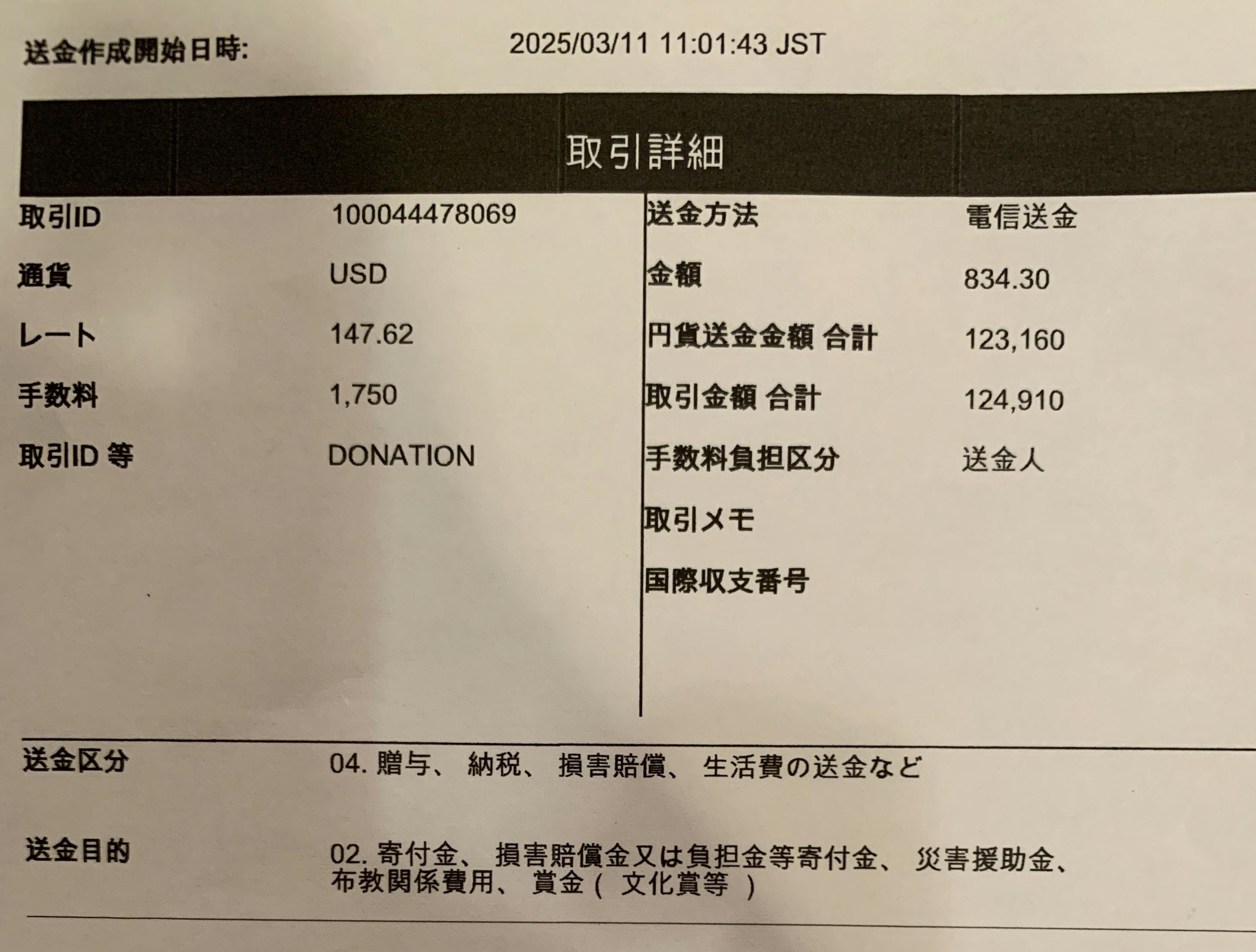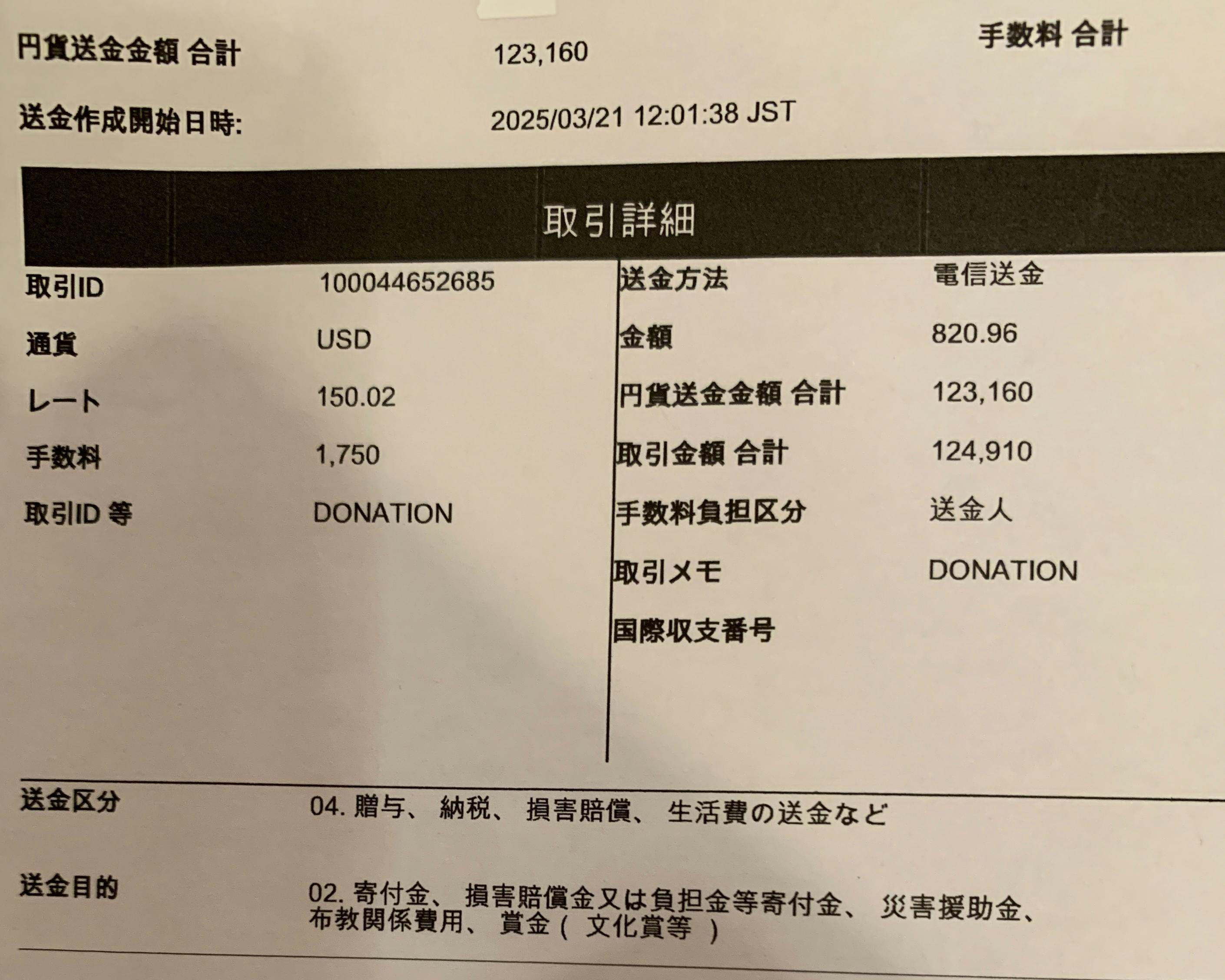 主催者の利用している銀行の都合で、一度送金した相手の情報は、取引後二日間は変更できませんでしたので、3日後(3月20日は祝日のため)の2025年3月21日に再度送金いたしました。(820.96USドル@1ドル150.02円)