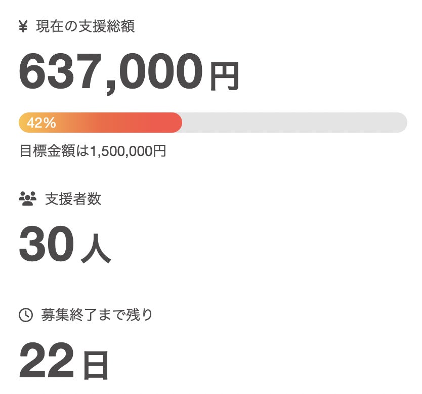 現在のプロジェクト状況の報告をさせていただきます。ご支援 30名ご支援額 637,000円達成率 42%となっております。残り 22日金額 863,000円\ご支援いただいた方が30名を超えました!/ご支援いただきましたみなさま、本当にありがとうございます!引き続き、拡散やSNSでのシェアをよろしくお願いいたします!!