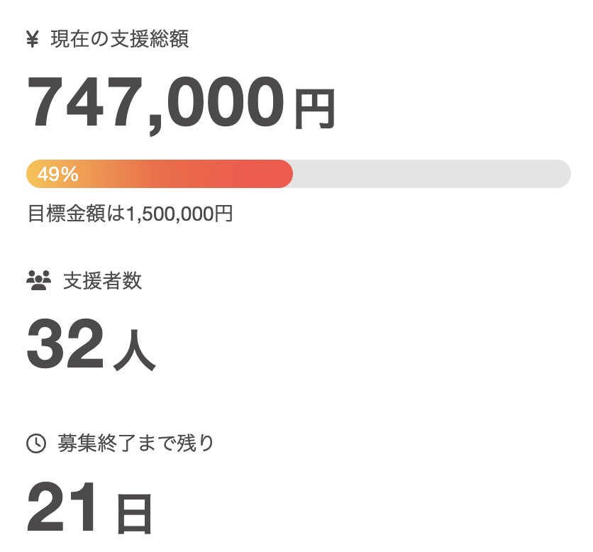 現在のプロジェクト状況の報告をさせていただきます。ご支援 32名ご支援額 747,000円達成率 49%となっております。残り 21日金額 753,000円達成率50%まであと少しです…!ご支援いただきましたみなさま、本当にありがとうございます!引き続き、拡散やSNSでのシェアをよろしくお願いいたします!!