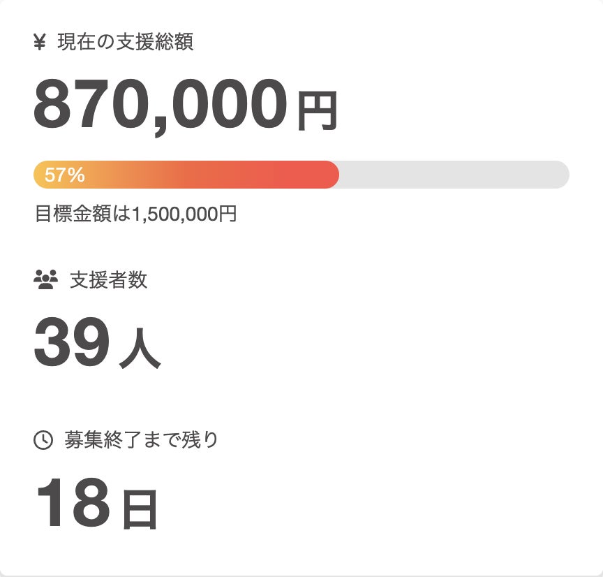 現在のプロジェクト状況の報告をさせていただきます。ご支援 29名ご支援額 631,000円達成率 42%となっております。残り 23日金額 869,000円42%達成しました!ご支援いただきましたみなさま、本当にありがとうございます!ここに来て少し停滞気味になっております…ご支援いただいた皆様に重なるお願いで恐縮ですが、身近な方への拡散や、SNSにてシェアいただきましたら大変嬉しいです!!引き続き、よろしくお願いいたします!!