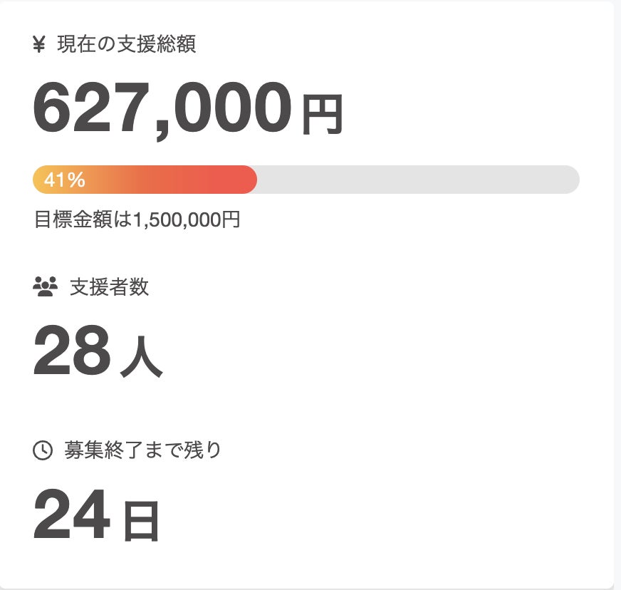 現在のプロジェクト状況の報告をさせていただきます。ご支援 28名ご支援額 627,000円達成率 41%となっております。残り 24日金額 873,000円ご支援いただきましたみなさま本当にありがとうございます!SNSにてご支援、拡散、シェアいただきましたら嬉しいです!引き続き、よろしくお願いいたします!!