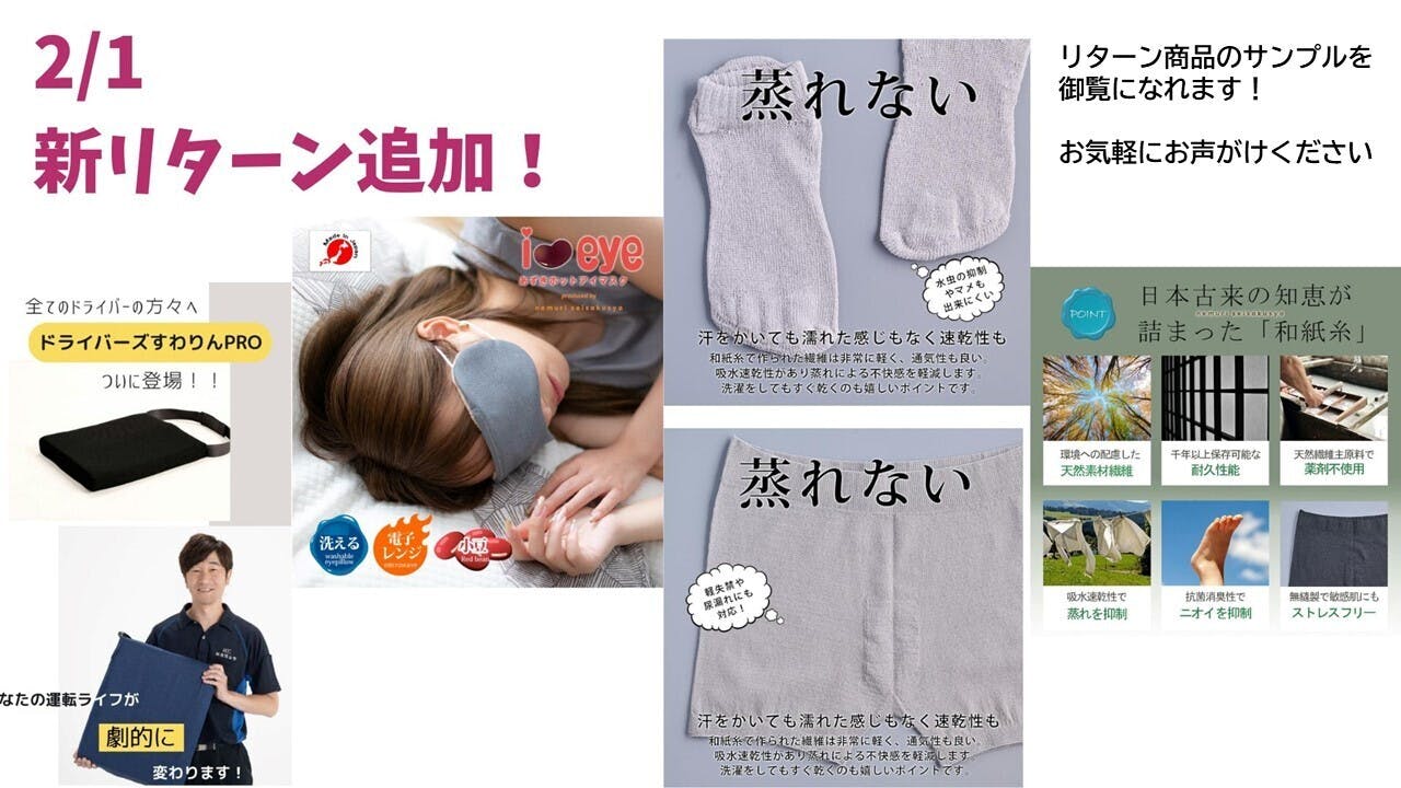 あずきホットアイピロー、和紙の糸で作ったボクサーショーツや靴下、ドライバーズすわりん、などは上記からご覧になれますが、21時にならないと購入画面に進めませんのでご注意ください。