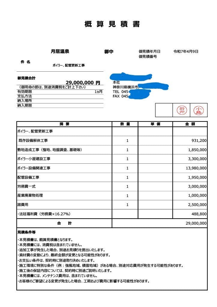 ボイラーメーカー、給排水工事業者等に依頼し、数社より工事代金のお見積りをいただきました。昨今の燃料費の高騰もあり、可能な限り高効率の省エネタイプのボイラーを発注予定ですが、ボイラーだけではなく、接続する給水管の劣化も激しく、漏水も至る所で発生しており、給水管の引き直し工事代金も含んでいるため、トータルで約1,000万円ほどかかる予定です。