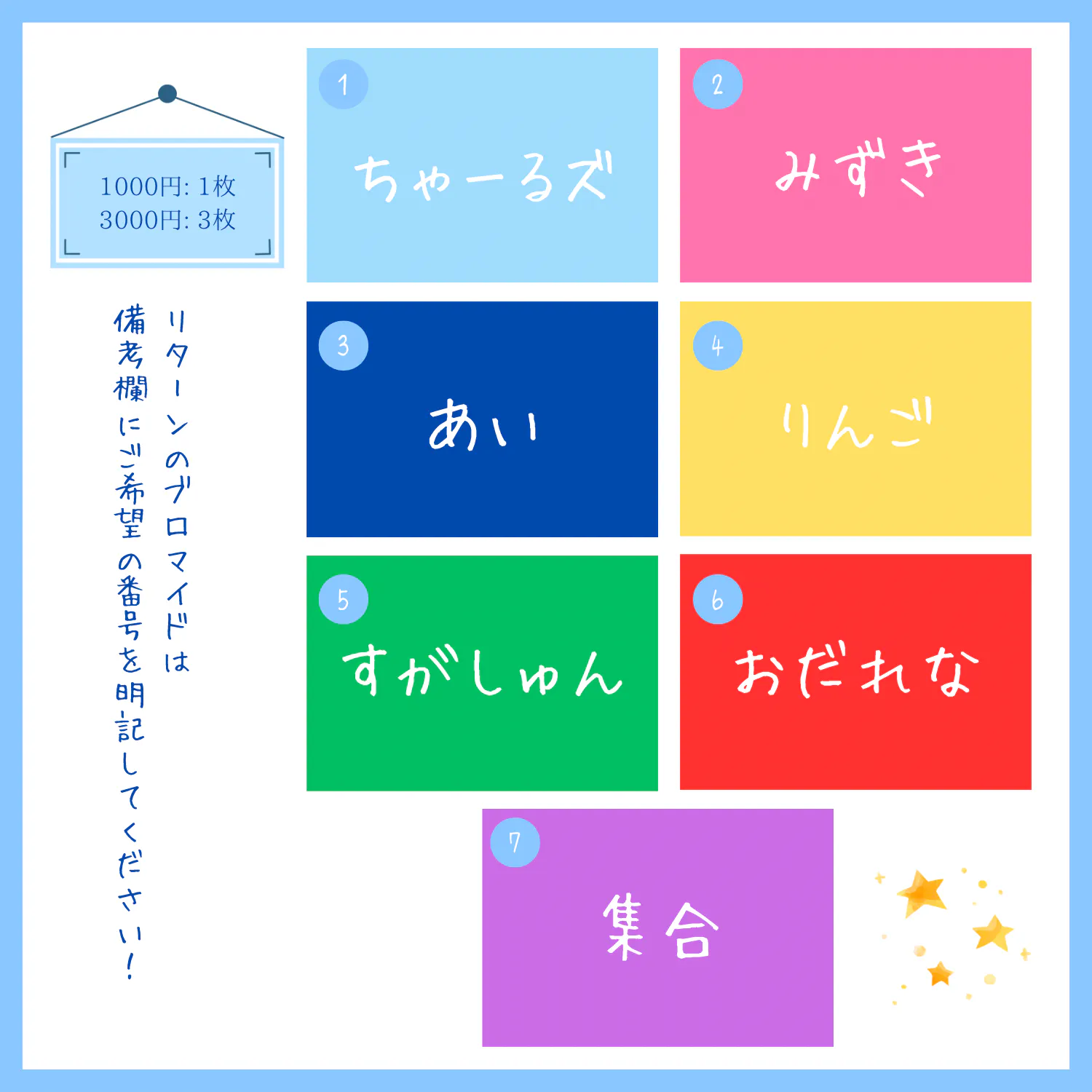 ※3)ブロマイドはご希望の番号を備考欄に枚数分ご記載ください。