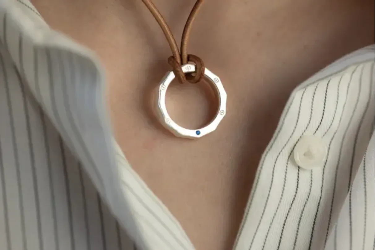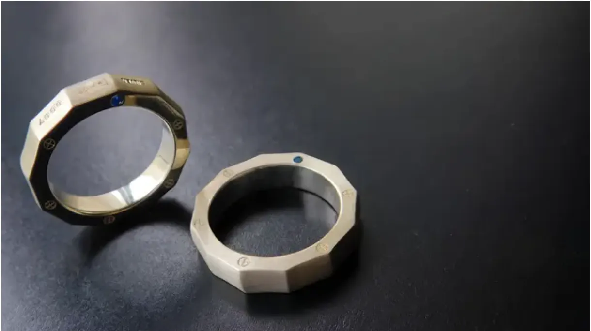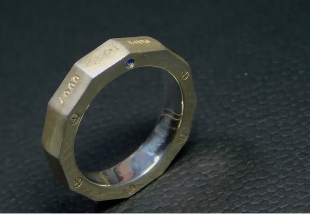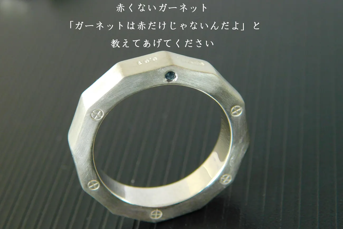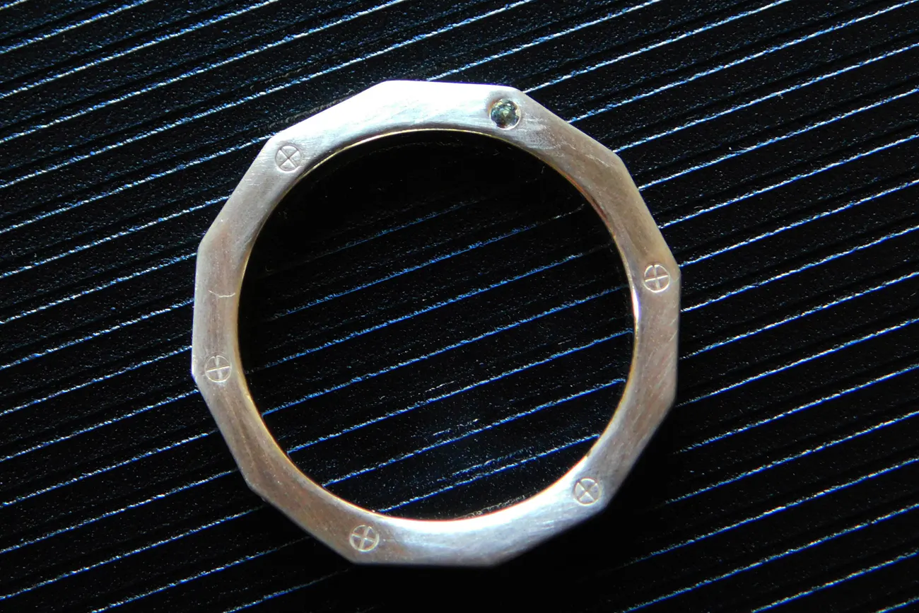 この12角形のフォルムとサイドに輝くレアストーンはデザインポイントであり、また、ネックレスとしてもお楽しみ頂けるリングになりました
