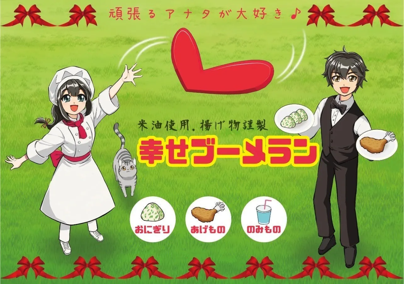 私たちはこの幸せブーメランというネーミングに恥じないような仕事をするために、今後、第一に自信作のフライドチキンとゼリーを多くの方々に提供して喜んで頂きます。