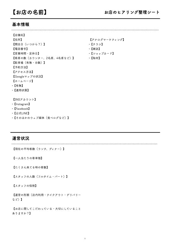 詳しい内容は下記の「お店のヒアリング整理シート」をもとに行います。