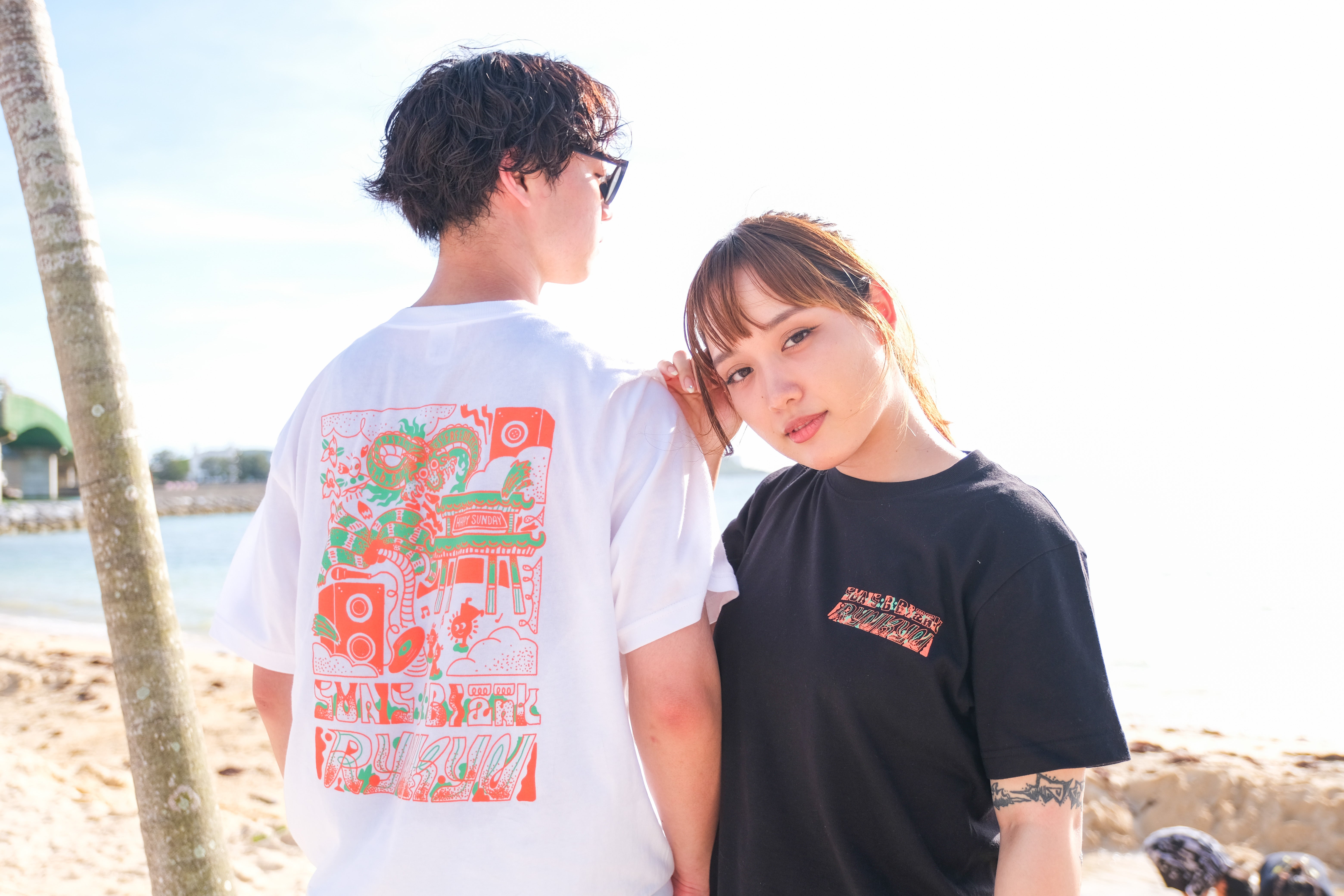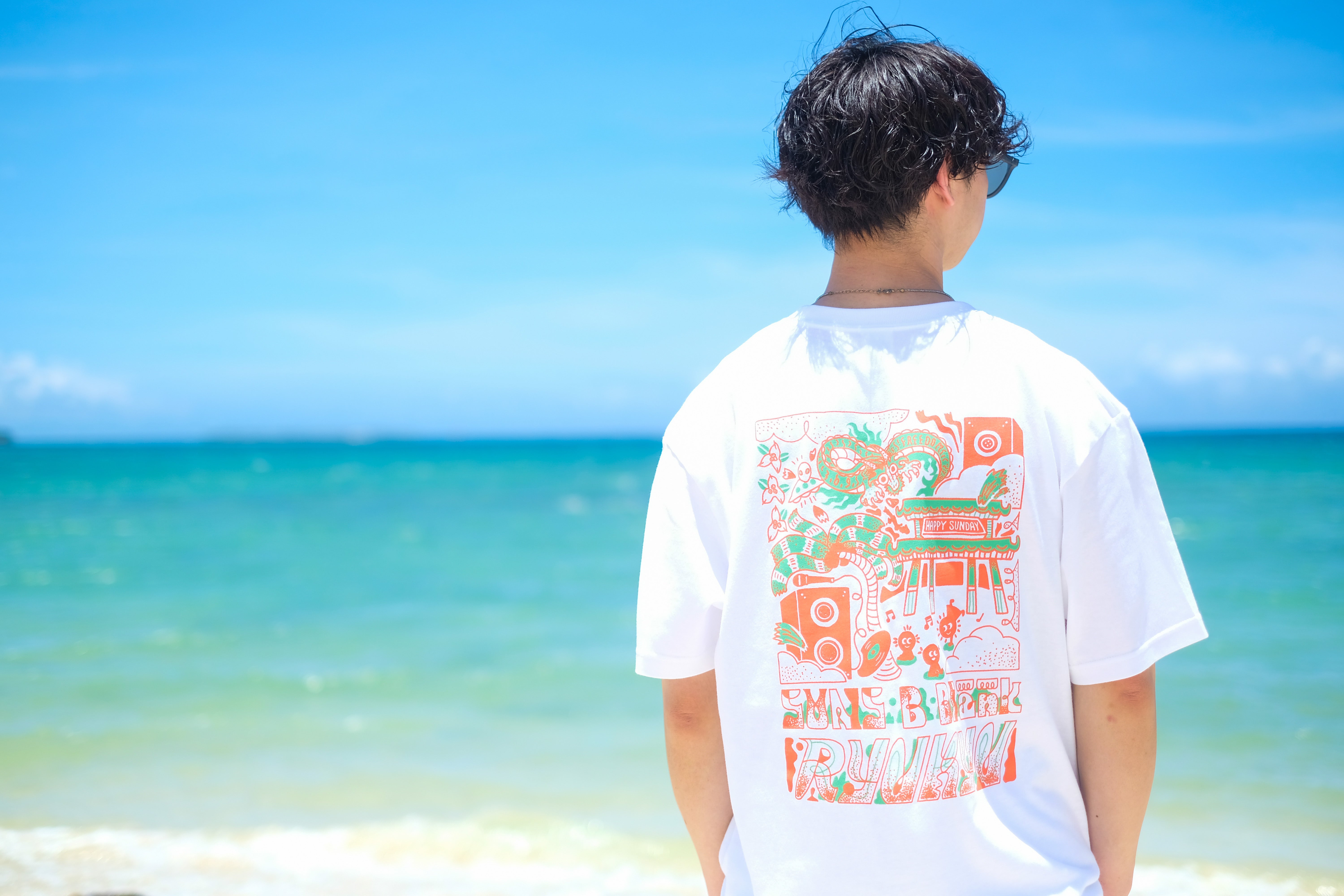 ②HAPPY SUNDAY 2025 デザイン&カラーGoods Tシャツ・パーカー・トレーナー2025年カラーはオレンジ×グリーン。会場である兼久海浜公園から見える嘉手納町の美しい夕陽のオレンジと、沖縄の自然を大切にしたいというイメージからグリーンを組み合わせたカラーリングです。※パーカー・トレーナーは裏パイル生地になります。