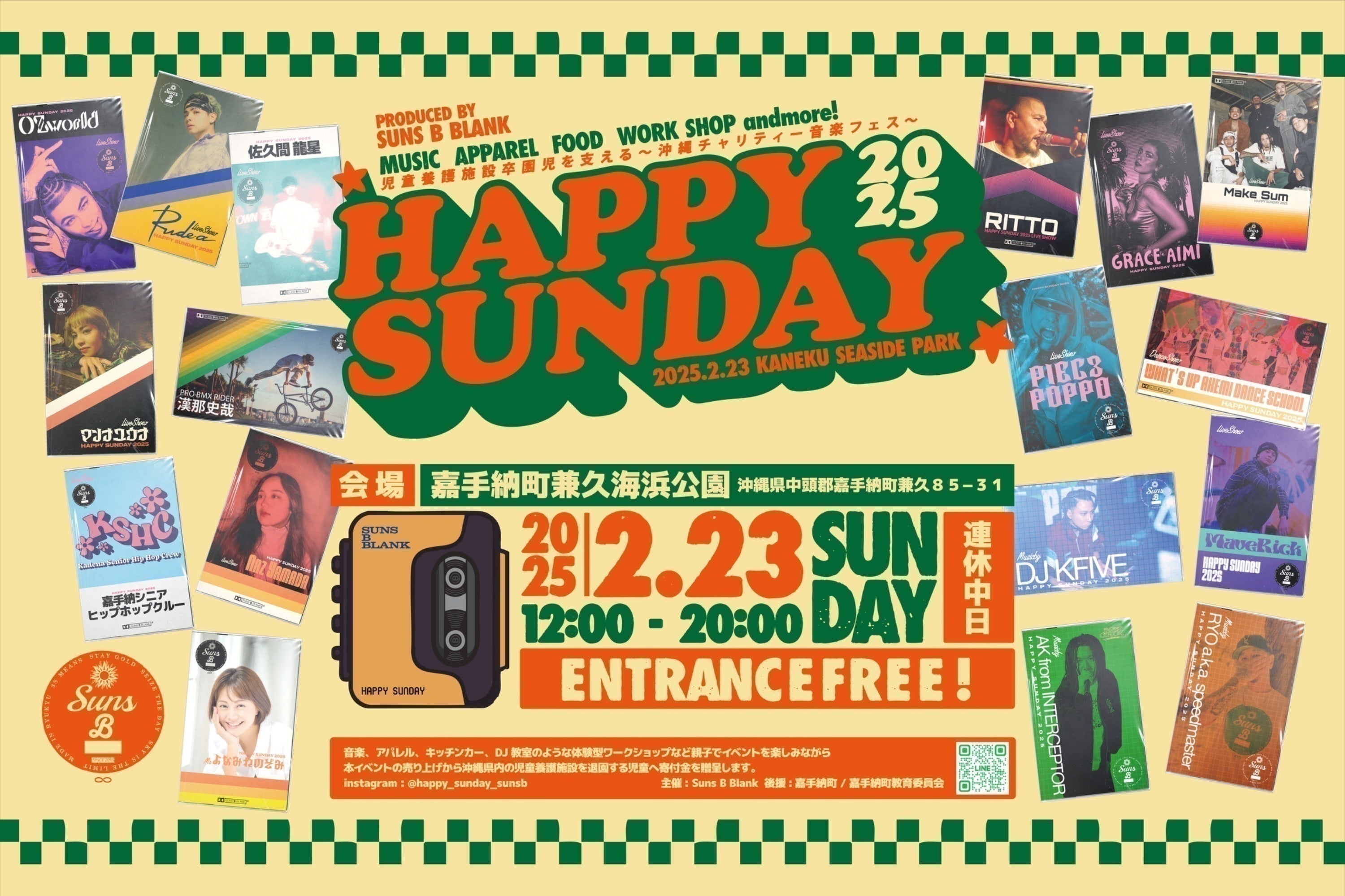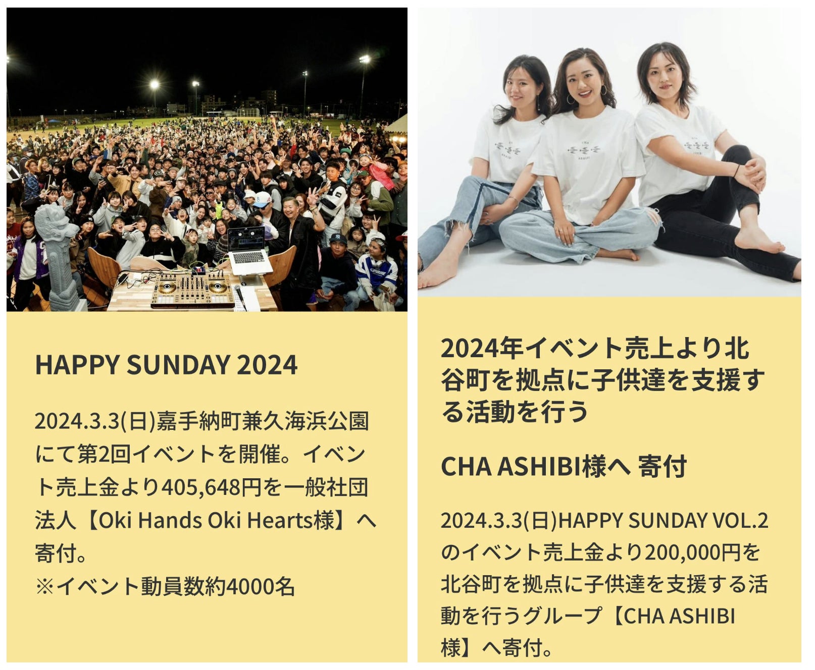 2025/08/24 07:54HAPPY SUNDAY 2025【Movie made by CHiNa & Beats by George Bolton】沖縄県嘉手納町兼久海浜公園にて2025年2月23日(日)に開催致しました【HAPPY SUNDAY 2025(第3回)】にご来場を頂きました皆様、またクラウドファンディングや協賛・様々な形でのご協力を頂きました沢山の企業様や個人の皆様方、誠にありがとうございました。今回のイベントにおけるクラウドファンディングの支援金、企業様からの協賛金やイベント当日の売上、開催前後における出店者の売上や当方(HAPPY SUNDAY実行委員)の売上収益の中から合計【700,000円】を寄付金として寄付をさせて頂きました。寄付先は、イベントの趣旨をご説明し、訪問させて頂きました以下の沖縄県内の児童養護施設へ令和6・7年度卒園児童の為に2年度分を寄付させて頂きました。① 美さと児童園(沖縄市)② 石嶺児童園(那覇市)③ 島添の丘(南城市)④ 愛隣園(与那原町)※①~③(令和6・7年度卒園児童分)、④(令和7年度卒園児童分)又、次回のHAPPY SUNDAYへ準備活動予算として【308,791円】をイベント収益の中からHAPPY SUNDAY実行委員がお預かりをさせて頂き、次回の活動に向けた準備を皆様へのご返礼やご挨拶が終わり次第に進めさせて頂きます。OTV Live News イット!https://youtu.be/GheD9pU5wWE?si=DeepeX-0d8nyKlVbYahooニュースhttps://news.yahoo.co.jp/articles/a6704b0397c895df1a01d55b9680c25e1ae2b376HAPPY SUNDAY2025収支報告https://camp-fire.jp/projects/803890/view/activities/742699HAPPY SUNDAY GOODS & Suns B Blank取扱店舗①RAWKYUInstagram: @rawkyu〒904-0115 沖縄県中頭郡北谷町美浜34−5 デポセントラルビル 1階(ドクターマーチン北谷跡地)②Orionfactoryhttp://www.orion-factory.com/Instagram: @orionfactory〒900-0014沖縄県那覇市松尾2-8-4 2F(2-8-4 Matsuo Naha city Okinawa Japan 2nd floor)TEL098-861-5288③Street Tailor沖縄県沖縄市上地4-1-23Instagram: @streettailor.okinawa もっと見るHAPPY SUNDAY 2025 活動報告