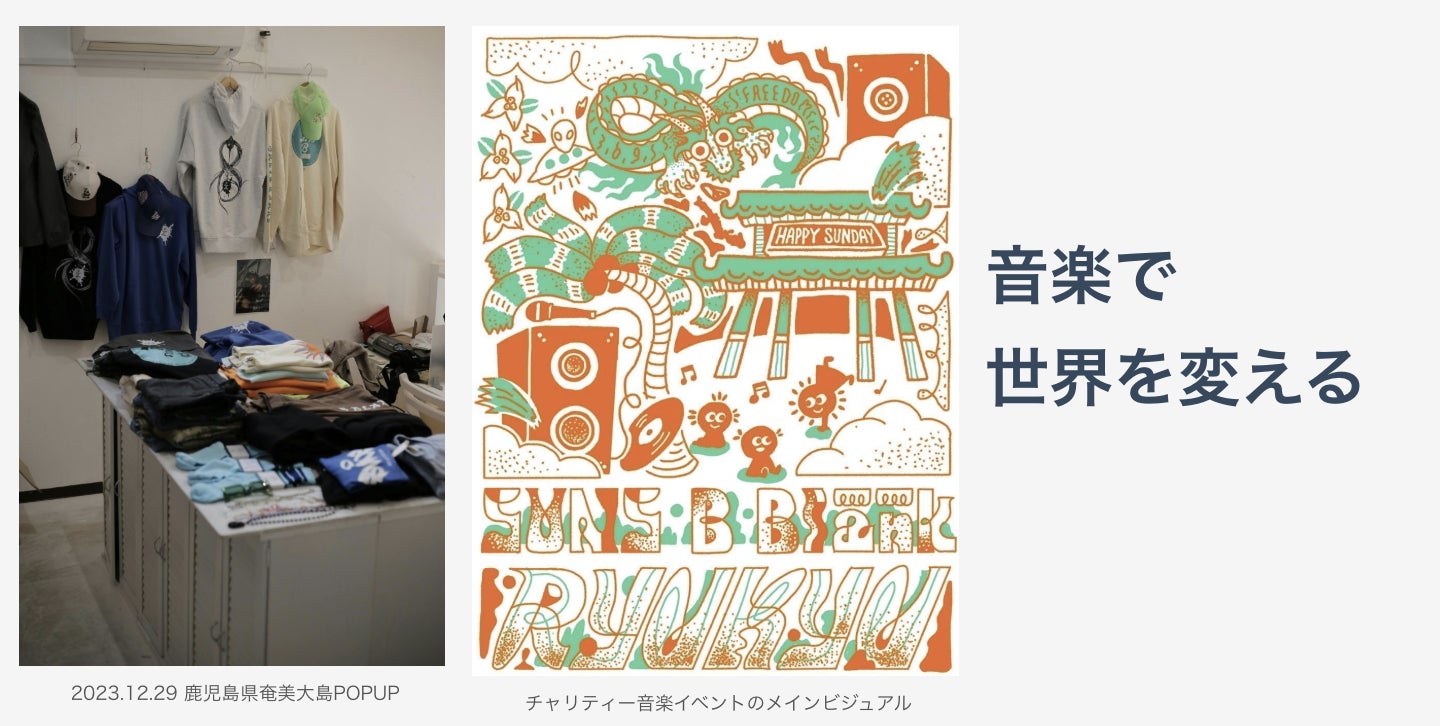 プロジェクト立ち上げのきっかけは、児童養護施設への支援活動を行なっている嘉手納町の一般社団法人の活動に共感したことが始まりです。児童養護施設を退園する子供たちのために、デザイン提供やTシャツ製作などのボランティア協力を2020年から始め、2023年よりチャリティー音楽フェスティバル【HAPPY SUNDAY】を主催をさせて頂いております。