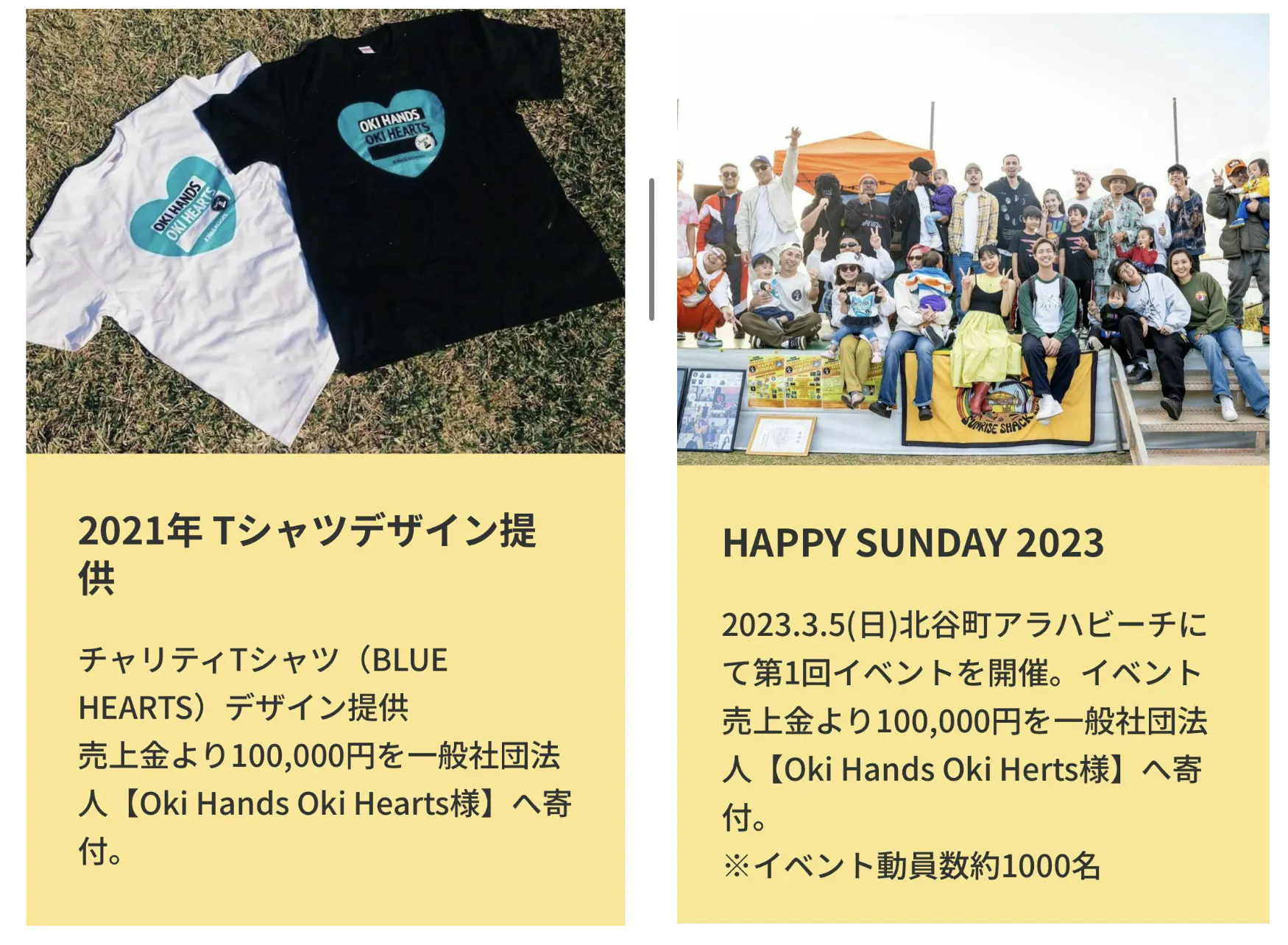 プロジェクト立ち上げのきっかけは、児童養護施設への支援活動を行なっている嘉手納町の一般社団法人の活動に共感したことが始まりです。児童養護施設を退園する子供たちのために、デザイン提供やTシャツ製作などのボランティア協力を2020年から始め、2023年よりチャリティー音楽フェスティバル【HAPPY SUNDAY】を主催をさせて頂いております。