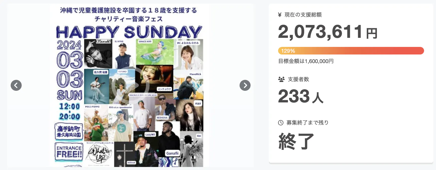 2025/08/22 16:08HAPPY SUNDAY 2025 活動報告文章作成・編集:HAPPY SUNDAY実行委員 松原啓士(BARON)この度、沖縄県嘉手納町兼久海浜公園にて2025年2月23日(日)に開催致しました【HAPPY SUNDAY 2025(第3回)】にご来場を頂きました皆様、またクラウドファンディングや協賛・様々な形でのご協力を頂きました沢山の企業様や個人の皆様方、誠にありがとうございました。また、後援について下さりました嘉手納町・嘉手納町教育委員会や、嘉手納町連合青年会 白龍の皆様、嘉手納町役場(産業環境課•都市建設課•社会教育課•総務課)の皆様方、この度は誠にありがとうございました。皆様のご支援とご協力により今回のイベントを事故もなく無事に開催をすることができました。そして、この場をお借りして嘉手納町社会福祉協議会•各自治会事務所の皆様、地域住民の方々、及び関係者の皆様からのご理解とご協力を心より感謝申し上げます。今回のイベントにおけるクラウドファンディングの支援金、企業様からの協賛金やイベント当日の売上、開催前後における出店者の売上や当方(HAPPY SUNDAY実行委員)の売上収益の中から合計【700,000円】を寄付金として寄付をさせて頂きました。寄付先は、イベントの趣旨をご説明し、訪問させて頂きました以下の沖縄県内の児童養護施設へ令和6・7年度卒園児童の為に2年度分を寄付させて頂きました。① 美さと児童園(沖縄市)② 石嶺児童園(那覇市)③ 島添の丘(南城市)④ 愛隣園(与那原町)※①~③(令和6・7年度卒園児童分)、④(令和7年度卒園児童分)又、次回のHAPPY SUNDAYへ準備活動予算として【308,791円】をイベント収益の中からHAPPY SUNDAY実行委員がお預かりをさせて頂き、次回の活動に向けた準備を皆様へのご返礼やご挨拶が終わり次第に進めさせて頂きます。 以下が今回イベントの収支報告となります。(1)イベント売上合計 【6,281,651円】(2)イベント開催経費合計 【5,972,860円】(1)ー(2)=(3)【1,008,791円】 ※【700,000円を寄付、308,791円をお預かり】・売上内訳(1)売上総額6,281,651円(1)―① ドリンク売上・出店者出店料・オフィシャルグッズ売上などイベント当日売り上げ 1,116,804円(1)―② イベント前Goods売り上げ 264,154円イベント前からオフィシャルGOODSの売り上げにご協力頂きました皆様・オリオンファクトリー様・Street Tailor様・(株)グローバルアイランド様・SHUHARI BIKE WORKS OKINAWA様・LIFE dailywear 様・沖縄キリスト教学院大学 同窓会 様(1)―③イベント後Goods売り上げ・ドリンク売り上げなど 625,198円(1)―④ 協賛金総額(法人18社)3,350,000円(1)―⑤ クラウドファンディング 925,495円実施期間:2024年12月10日〜2025年2月26日目標金額 300,000円に対し、支援総額1,138,369円 (達成率379%)campfire手数料212,874円が引かれ3月31日に925,495円が振込されました。支出内訳(2)運営費合計5,972,860円 【内訳】・音響機材、ステージ警備代金・アーティスト交通費及び宿泊費(221名 / 20組)その他、雑費(ラミネート、ボランティア弁当代金、雨ガッパ代金等) 3,956,217円・クラウドファンディング返礼品・オフィシャルグッズ制作費用・スタッフジャケット制作費・返礼品梱包材・発送費用1,167,673円・カメラマン撮影、編集費用・パンフレット・ポスター印刷代157,634円」・イベント保険費用(東京海上日動火災保険株式会社) 28,780円・仮設トイレ(8基)使用料125,165円・お酒・飲料品代金 515,791円・会場使用料・夜間ナイター照明使用料 21,600円(1)ー(2)=(3)イベント収益の使い道① 児童養護施設へ【700,000円】寄付② 次回の準備活動予算として【308,791円】をHAPPY SUNDAY実行委員にてお預かり活動報告は以上です。最後に、ここまでご覧頂き誠にありがとうございました。今回の成功と改善点を活かし、次回もHAPPY SUNDAYが開催できるよう我々も精進していきます。合計3回のイベントを通して、合計1,405,648円の寄付金を生み出すことができた事に、協力頂いている皆様に心から感謝申し上げます。沖縄県や世界中の子供達に教育・音楽・ファッションなどを通して、人々が支え合い発展していける環境や社会を作っていきます。HAPPY SUNDAY2025へご協力頂き、誠にありがとうございました。HAPPY SUNDAY実行委員一同主催者:HAPPY SUNDAY実行委員 運営責任者:松原 千裕 イベント運営責任者:株式会社グローバルアイランド運営メンバー松原 啓士照屋 亮松川 龍貴宮崎 慎吾上原 慎太郎玉城 尚吾佐久川 恵伊波 盛晃 もっと見る
