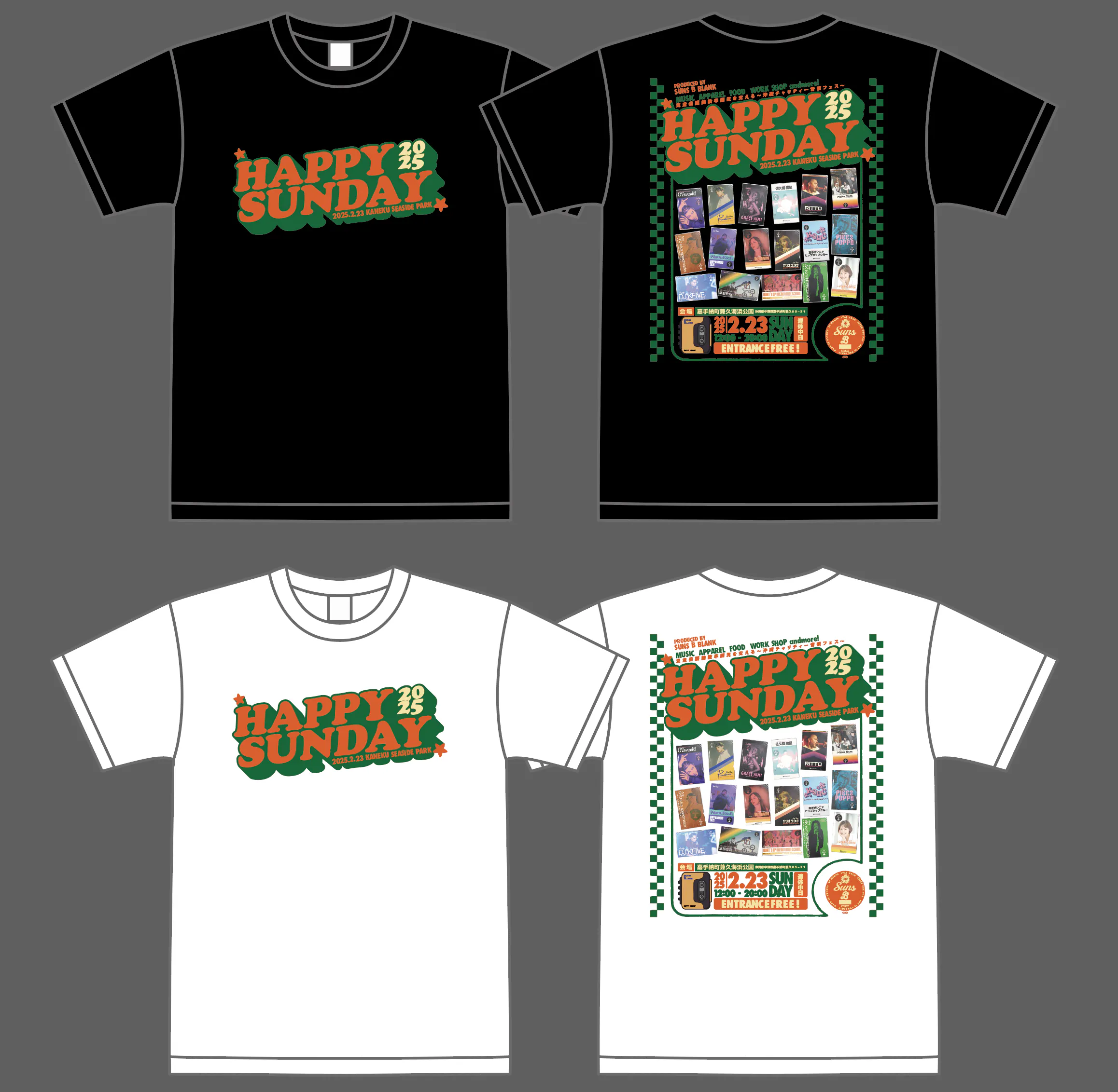 ②HAPPY SUNDAY 2025 デザイン&カラーGoods Tシャツ・パーカー・トレーナー2025年カラーはオレンジ×グリーン。会場である兼久海浜公園から見える嘉手納町の美しい夕陽のオレンジと、沖縄の自然を大切にしたいというイメージからグリーンを組み合わせたカラーリングです。※パーカー・トレーナーは裏パイル生地になります。