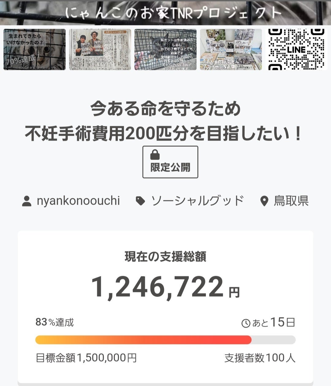100名様を記念して、考えていたことがありまして、集まった御支援をすべて野良猫の不妊手術費用に充てることにいたしました。詳しくはInstagramをご覧ください。