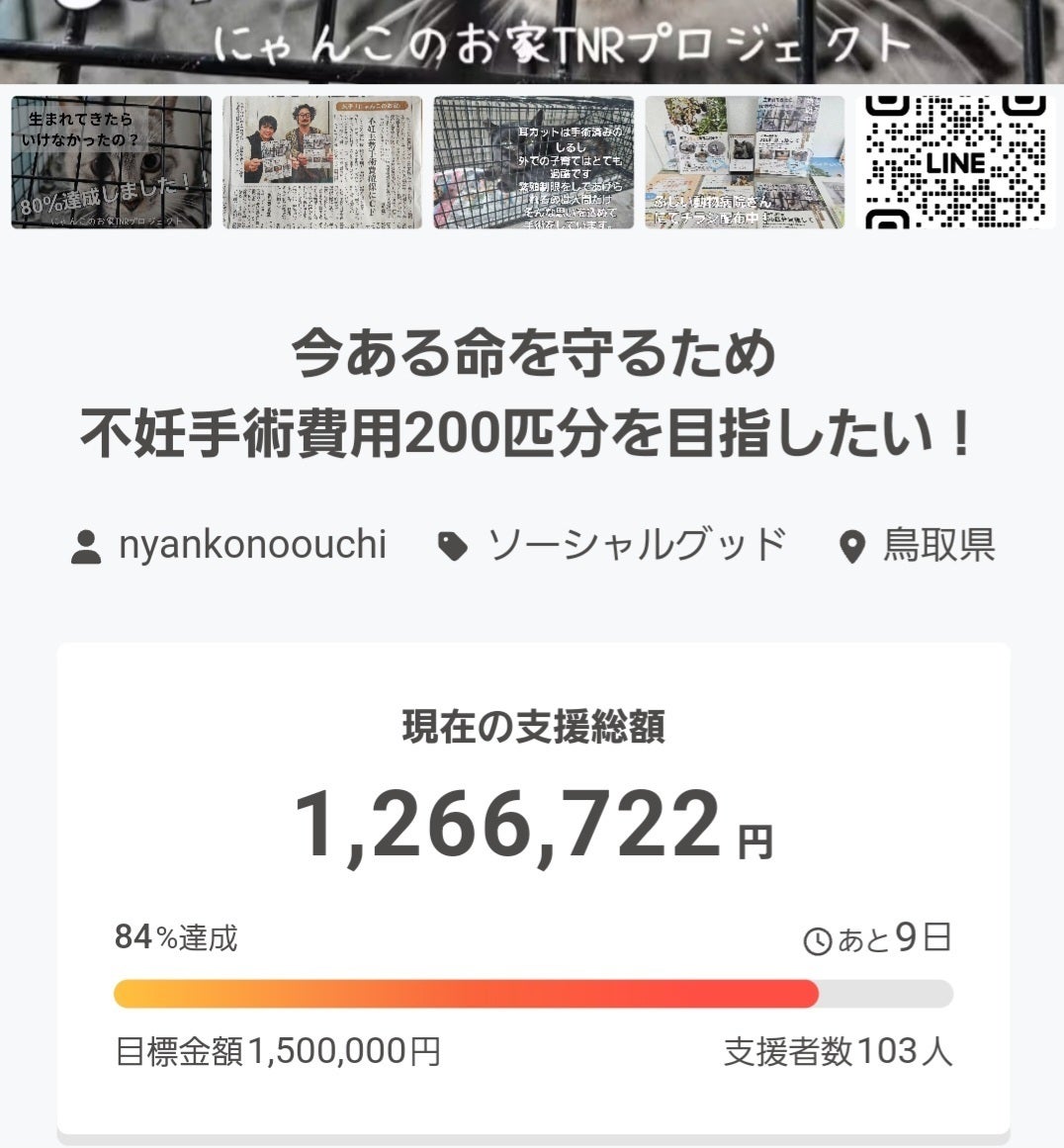 野良猫の不妊手術費用191匹分であと!9匹分となっています!